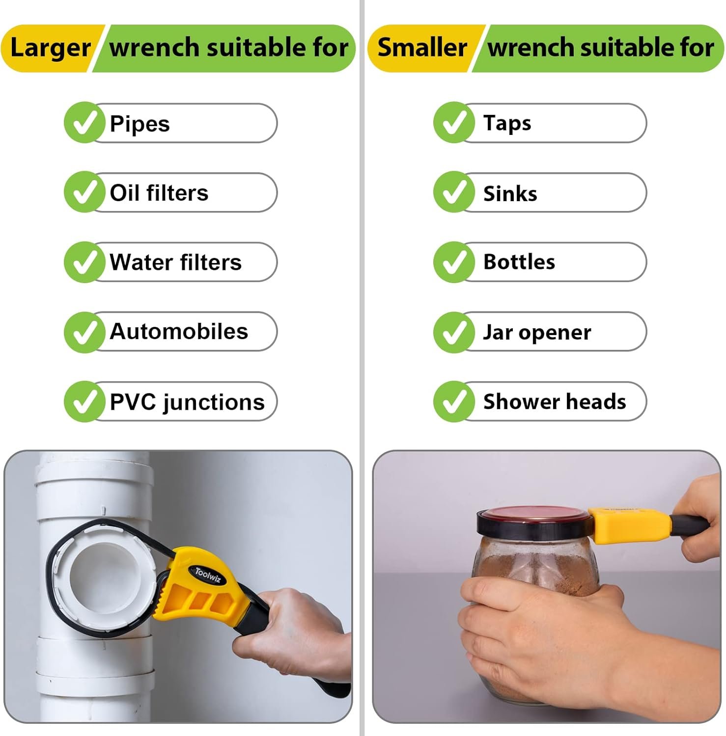 Warm Tips: The smaller strap wrench is not suitable for oil filter removal and big items such as drain pipes, and water filters.