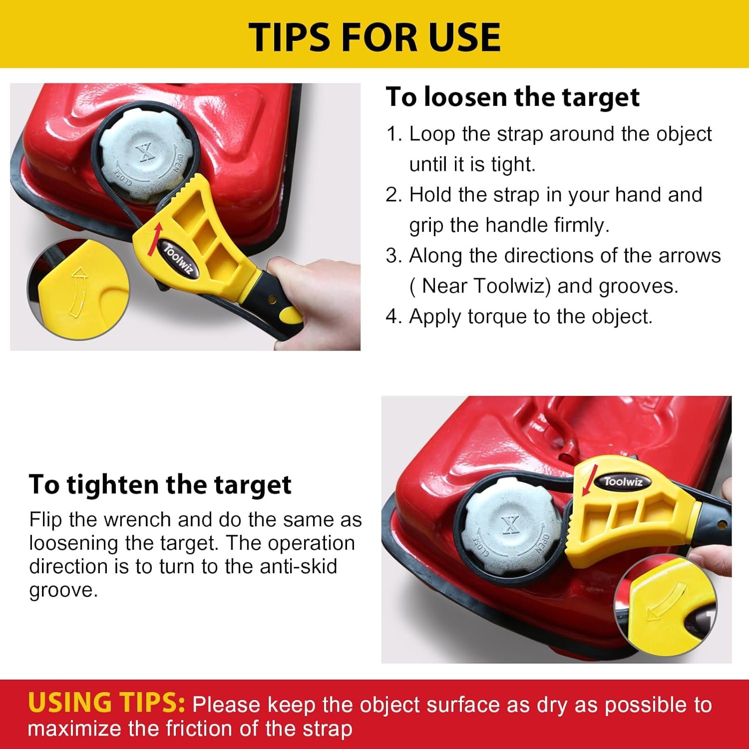 Tips for use: To loosen the target, pull the belt to adjust the diameter as needed. To avoid slipping, tighten the belt properly to the target and grab the rest belt with your hand. Along the arrow(near the Toolwiz) to guide the direction of force. The operation direction is to turn to the anti-skid groove. To tighten the target, flip the wrench and do the same as loosening the target.