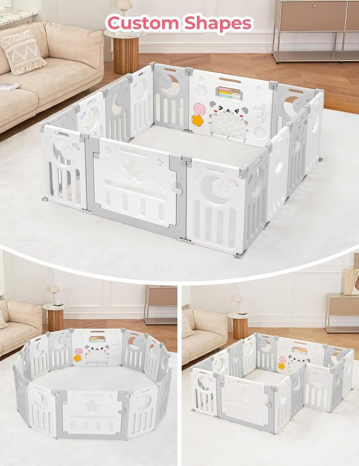 【ADJUSTABLE SHAPE & SIZE】14 panels can form a foldable playpen measuring 60x60x24 inches, covering over 25 square feet, with the flexibility to switch to different shapes such as round, rectangle, and square. You can also adjust the size of the playpen by increasing or decreasing the number of panels to fit any space.