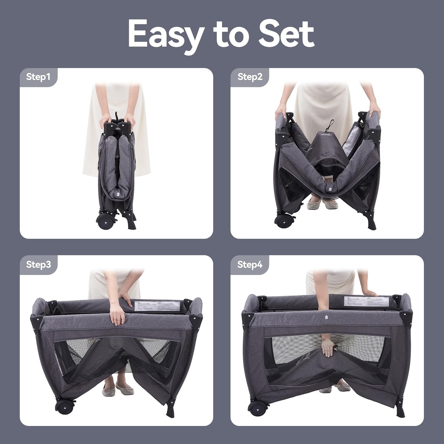 【Easy to Assemble】Very easy to assemble, the baby travel playard doesn’t require a lot of setup and can be stored or reassembled in minutes. Just snap the bassinet’s frame into place and the cot is ready to use. It’s also easy to fold and pack or reassemble in seconds without any stress or complicated steps.