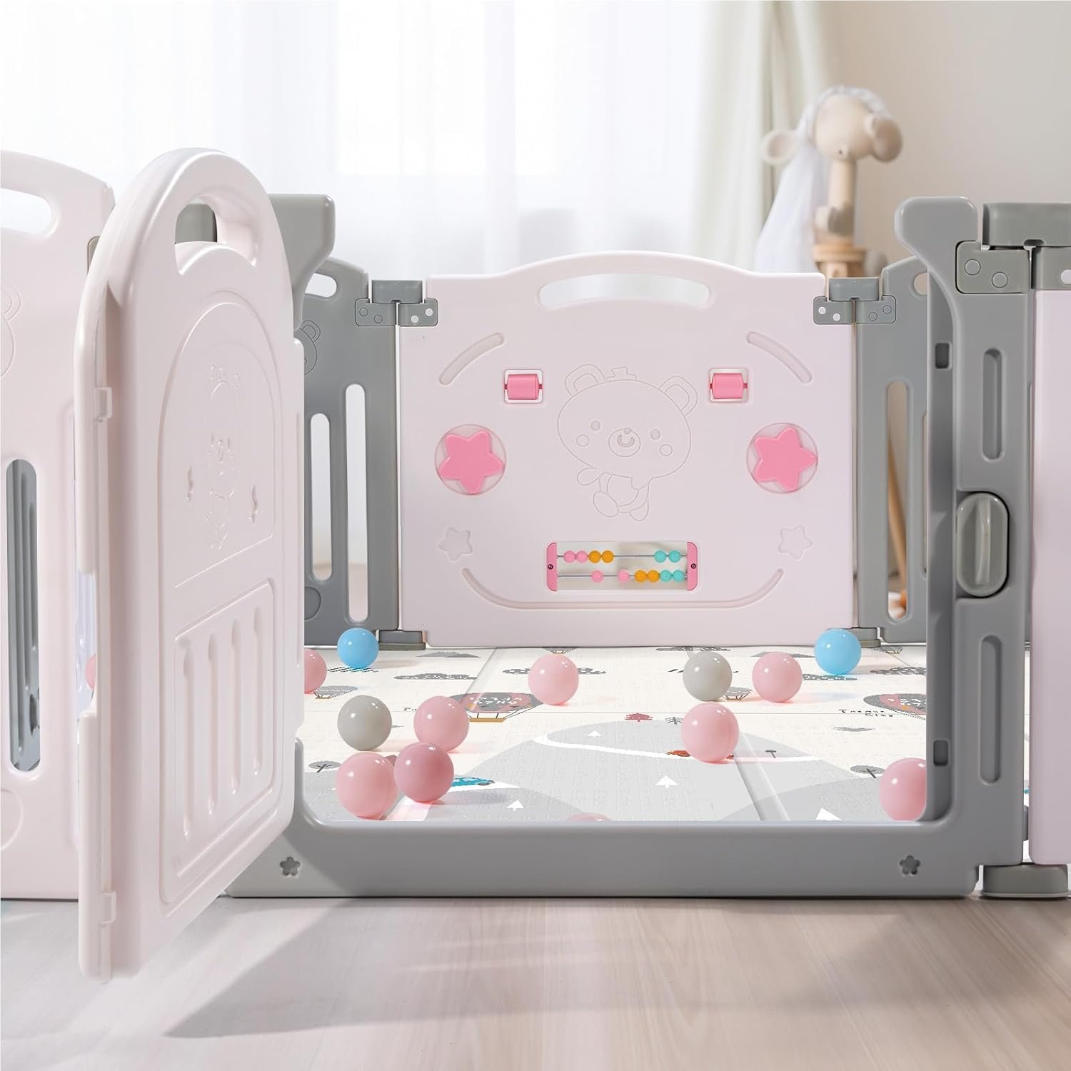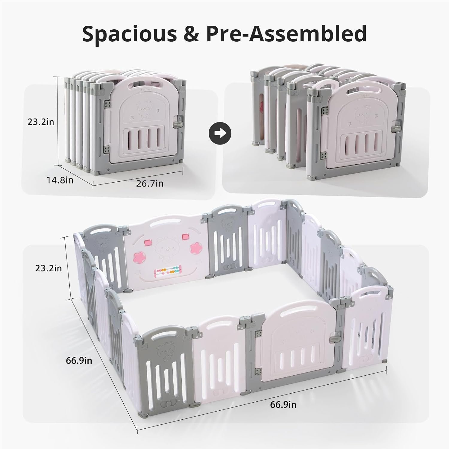 Generous Space: The baby playpen includes 18 panels, covers 31 sq. ft., and stands 23.2 inches tall, offering plenty of room for family activities and your child’s play