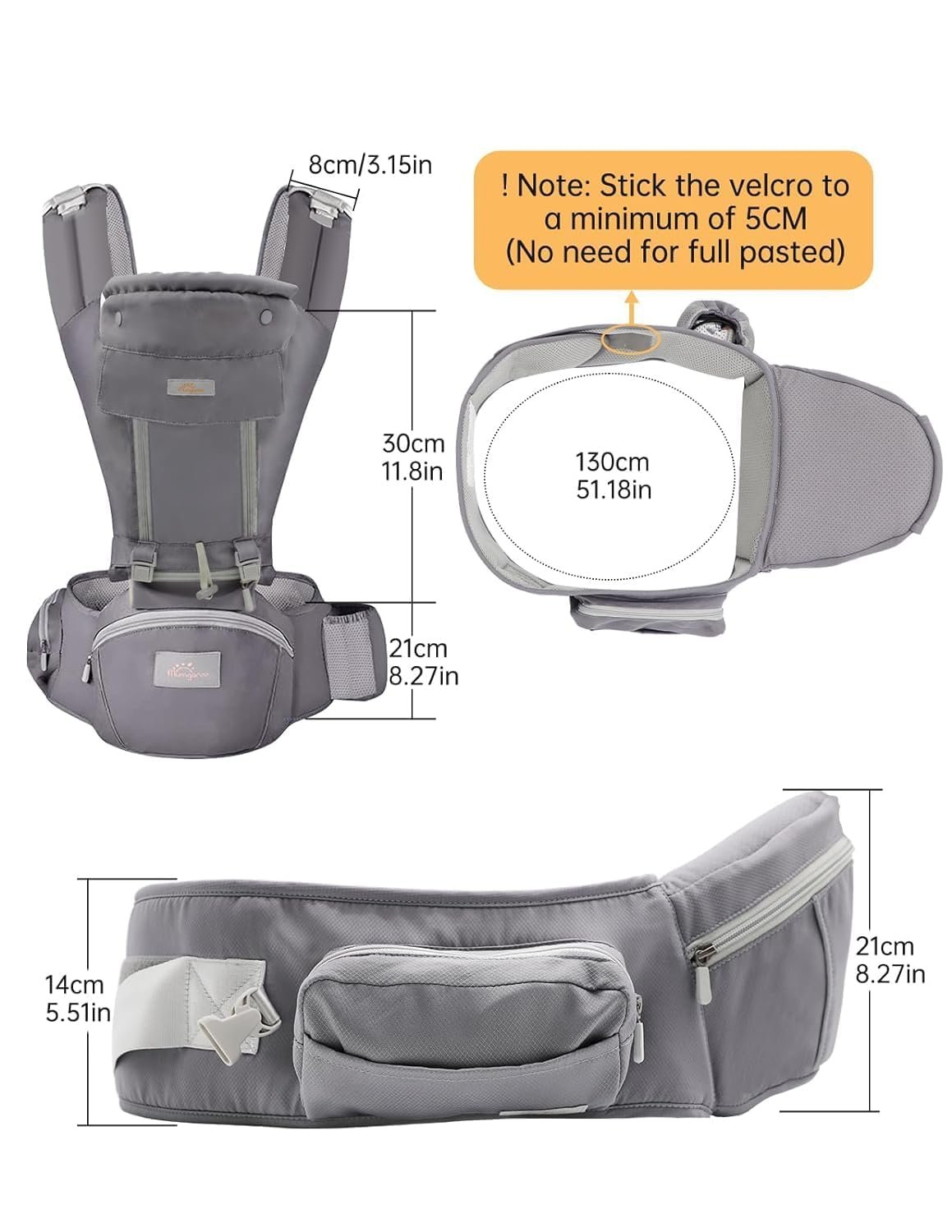 【More Thoughtful Designs】The hip carrier for baby comes with multiple storage pockets for bottles, diapers, wipes, keys, wallet, phone and more. The hood provides protection from the wind and sun for baby, and can even be used as a privacy cover for nursing mothers.
