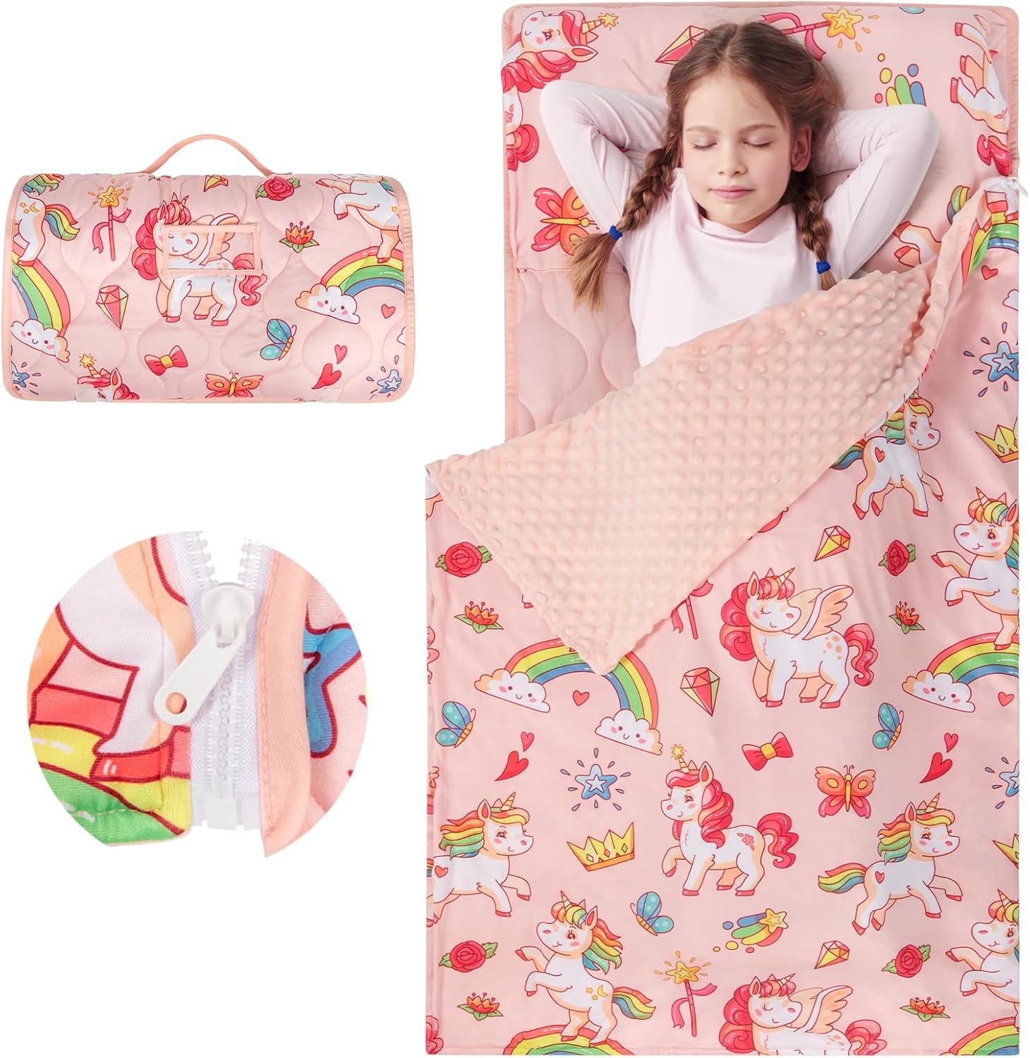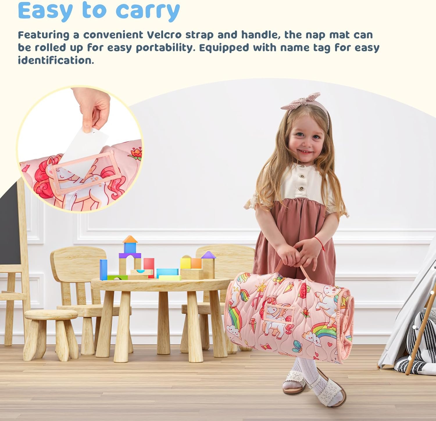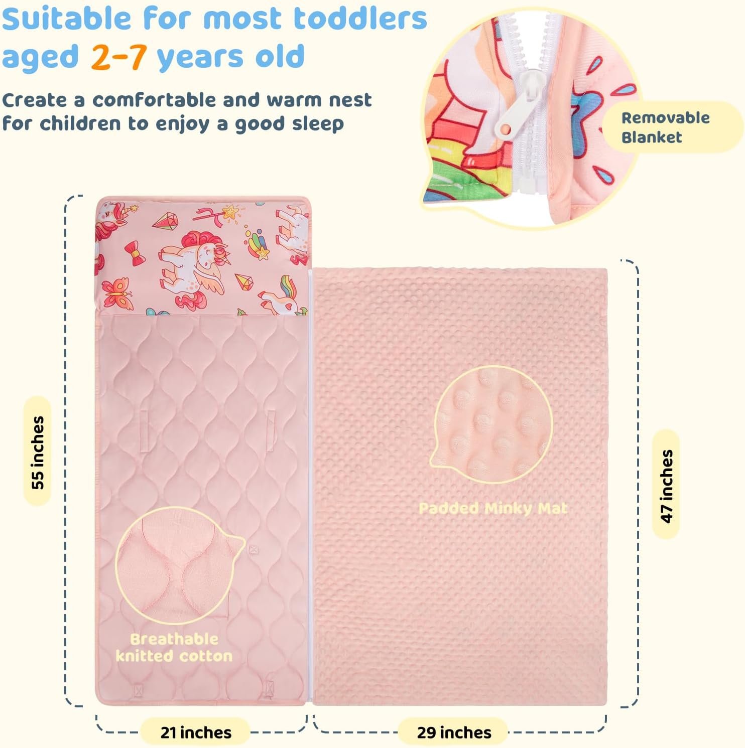 Toddler Nap Mat Extra Large 55‘’*29‘’ for 2-7 Years, Cotton Daycare Nap Mats with Removable Minky Blanket and Pillow, Boys Girls Sleep Mat for Preschool Kindergarten, Sleeping Bag Pink Unicorn
