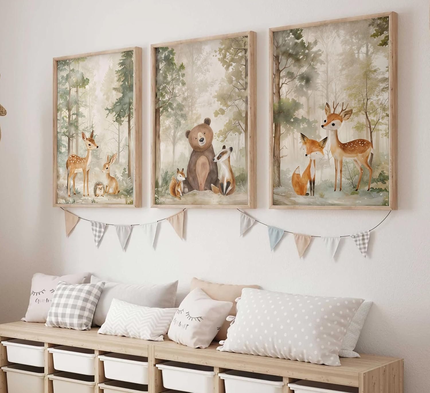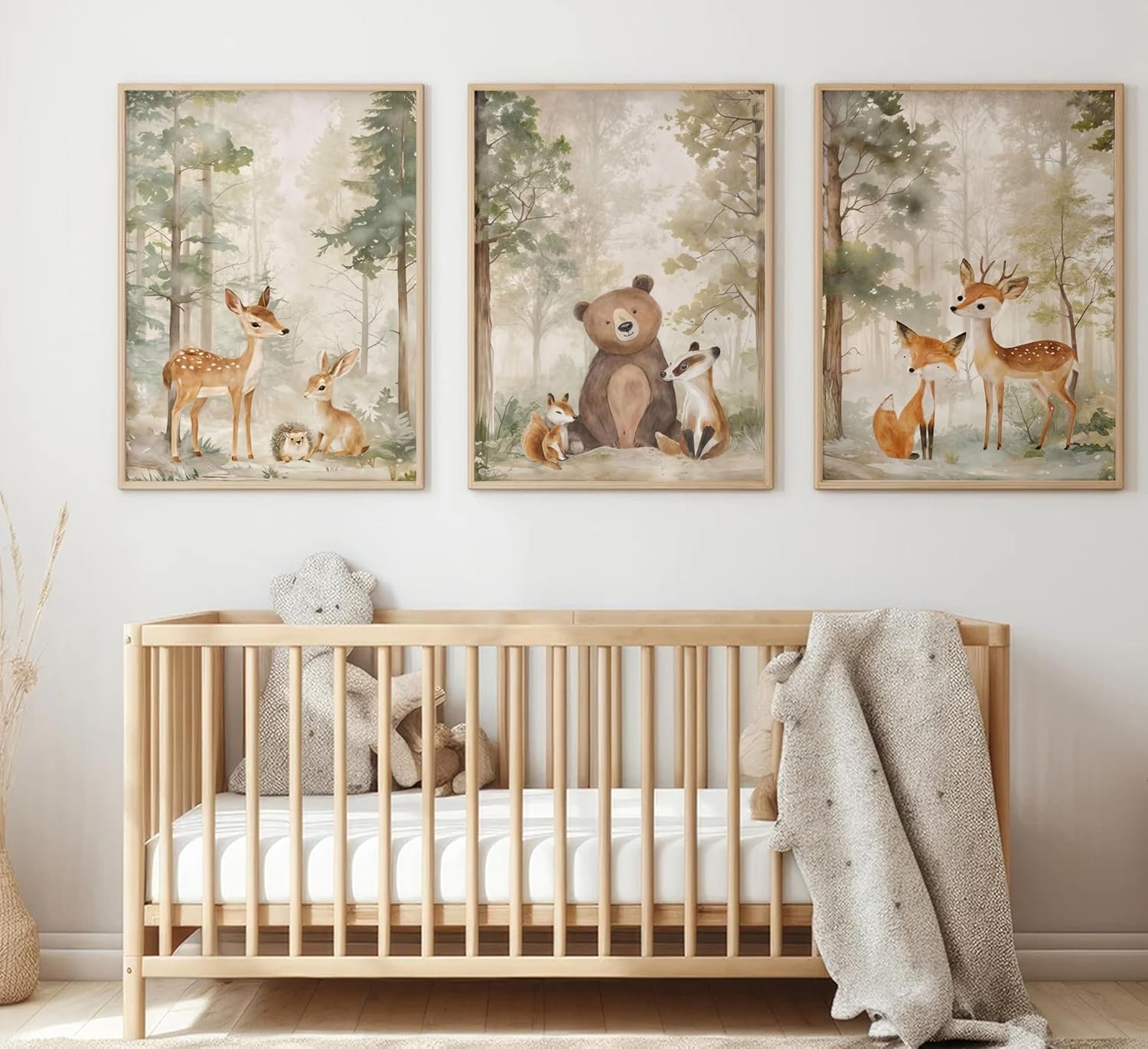 Woodland Animal Nursery wall art: This Woodland Animal nursery wall decor for boys girls, beige and green bedroom wall art nursery decor is perfect for babyboy/babygirl. The nursery animal wall art includes Deer, fox and bear, a completely wild woodland theme nursery decor