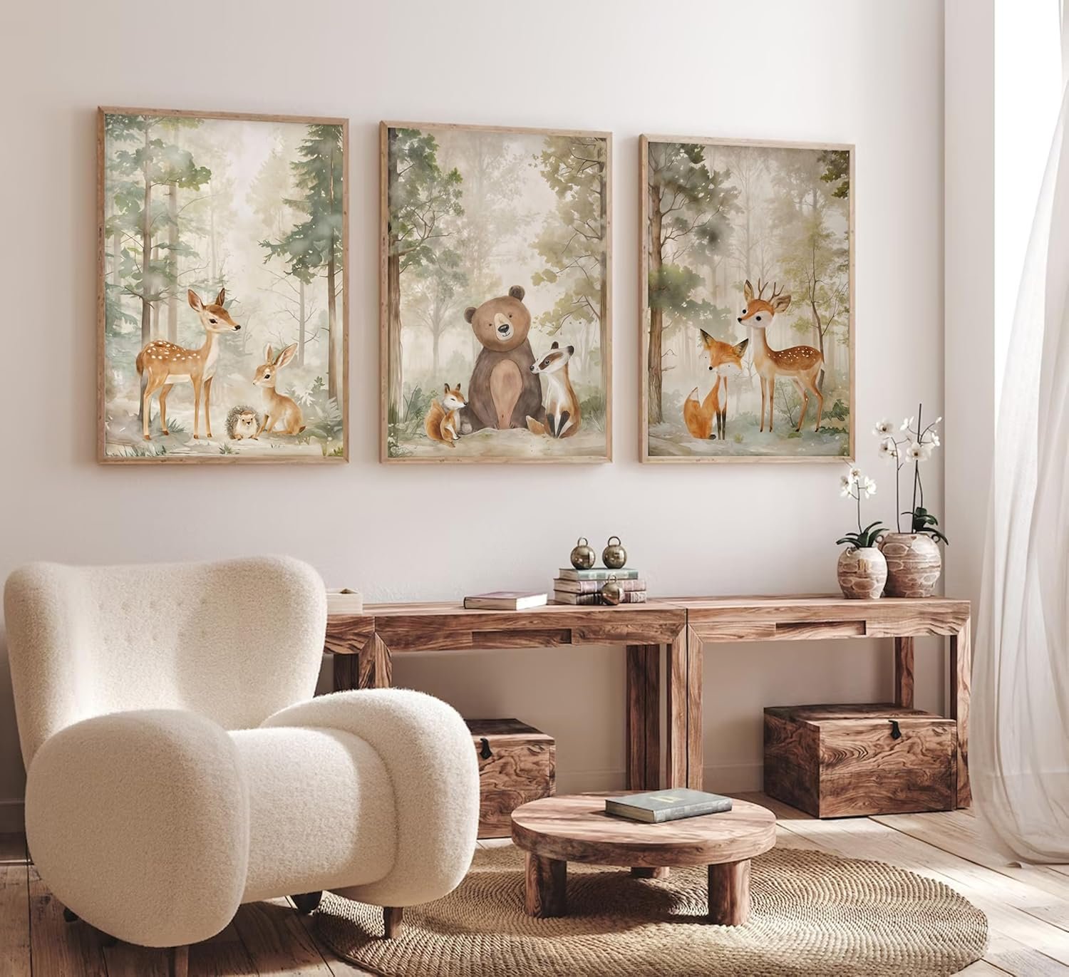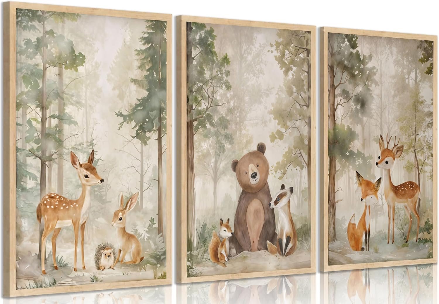 3Pcs Woodland Animal Nursery Canvas wall art Wild Animals Forest Paintings Pictures Wall Decor Fox Bear Deer Watercolor Poster Printing Artwork for Boys Room Girls Room Home Decoration Unframed