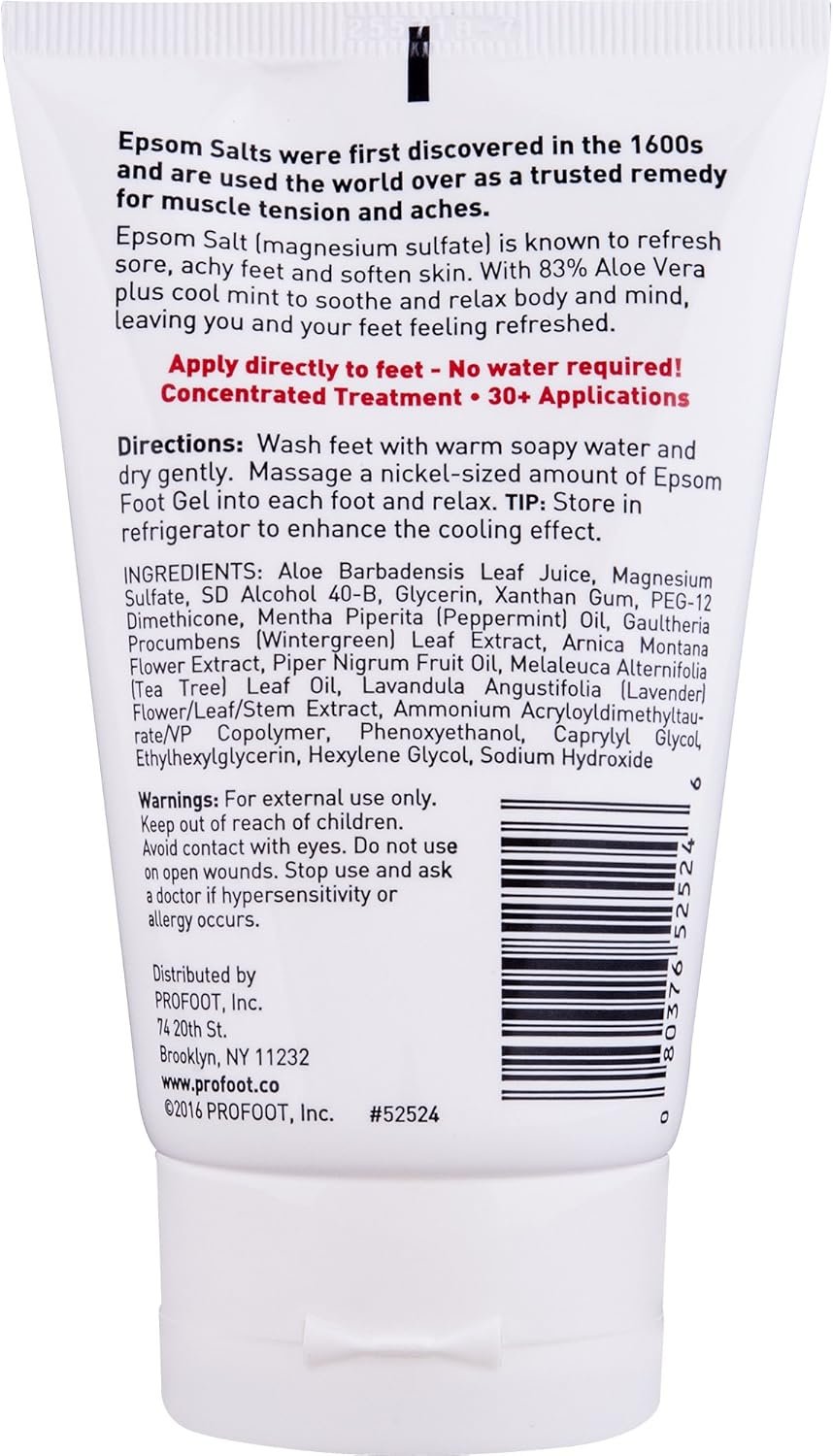 INDICATION:Profoot Epsom Salt Foot Gel Instant pain relief without the bath! Epsom Salt is a trusted remedy for muscle aches and pains that has been around for centuries. Now you can apply directly to your sore, achy feet to feel instant relief! With 83% Aloe Vera your feet also get an extra boost of moisturization.