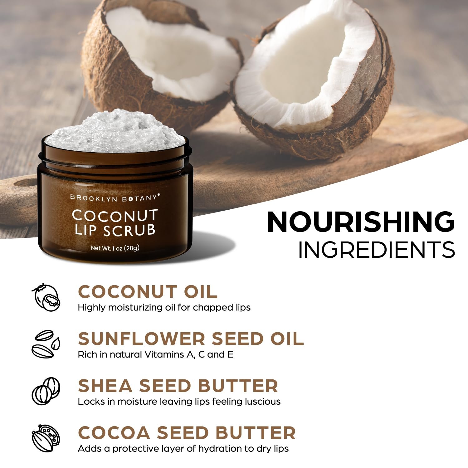 Brooklyn Botany Lip Scrub Exfoliator 1 oz – Lip Moisturizer for Dry Lips and Chapped Lips – Gentle Lip Exfoliator for Smooth and Brighter Lips – Coconut Flavor