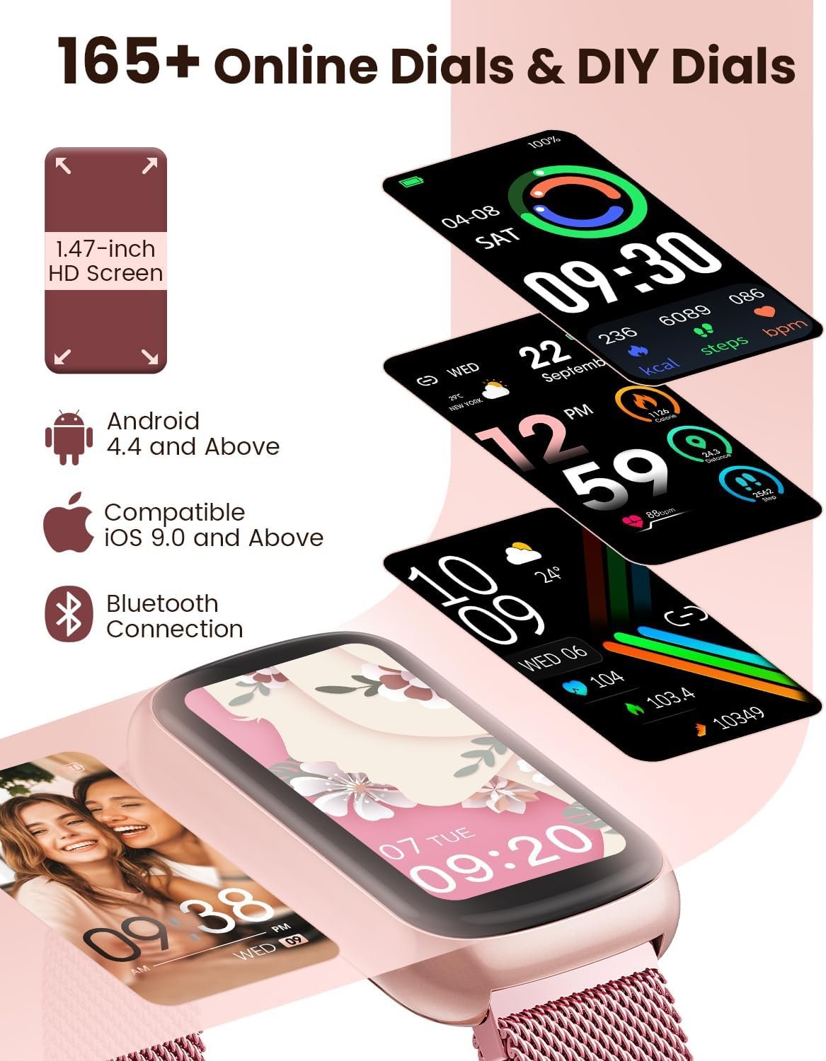 [2 Watch Bands, 165+ Watch Faces] The sporty silicone band and the exquisite metal band can match any clothes in your wardrobe, making you very charming no matter what occasion. 165+ watch faces are available for you to choose, and you can also customize your unique dial with your favorite photos. The combination of 14.5g ultra-light body and 1.47-inch high-definition screen brings the ultimate user experience to people who wear this fitness watch.