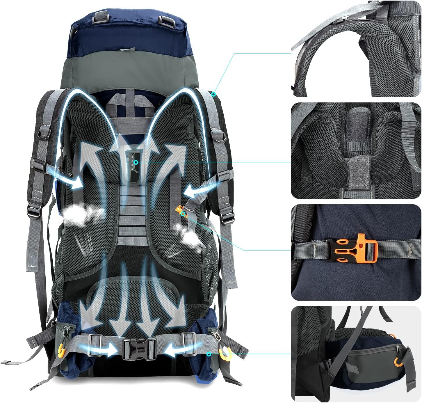 【90 Large Capacity with Milt-Compartments】The Size of backpack is 35X30X90cm and the loading capacity up to 90L.With multiple storage compartments,makes your items organized well and provides large storage space for your short-term travel.This camping backpack supports to put a water reservoir with straw in it