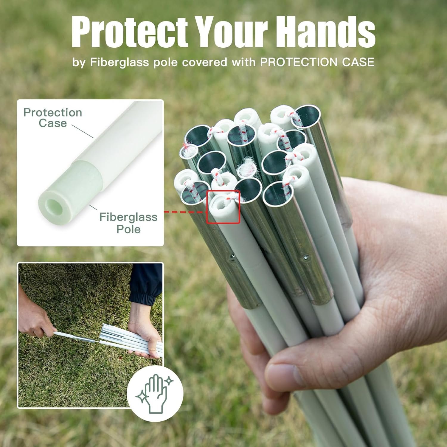 【Protect Your Hands】 Night Cat backpacking tent (ZP-10) uses the upgraded fiberglass pole that is fully covered with PROTECTION CASE. Comparing the traditional fiberglass pole under single layer only, the double layer design can protect your hands when assembling to avoid the tiny scrap inserting your hands