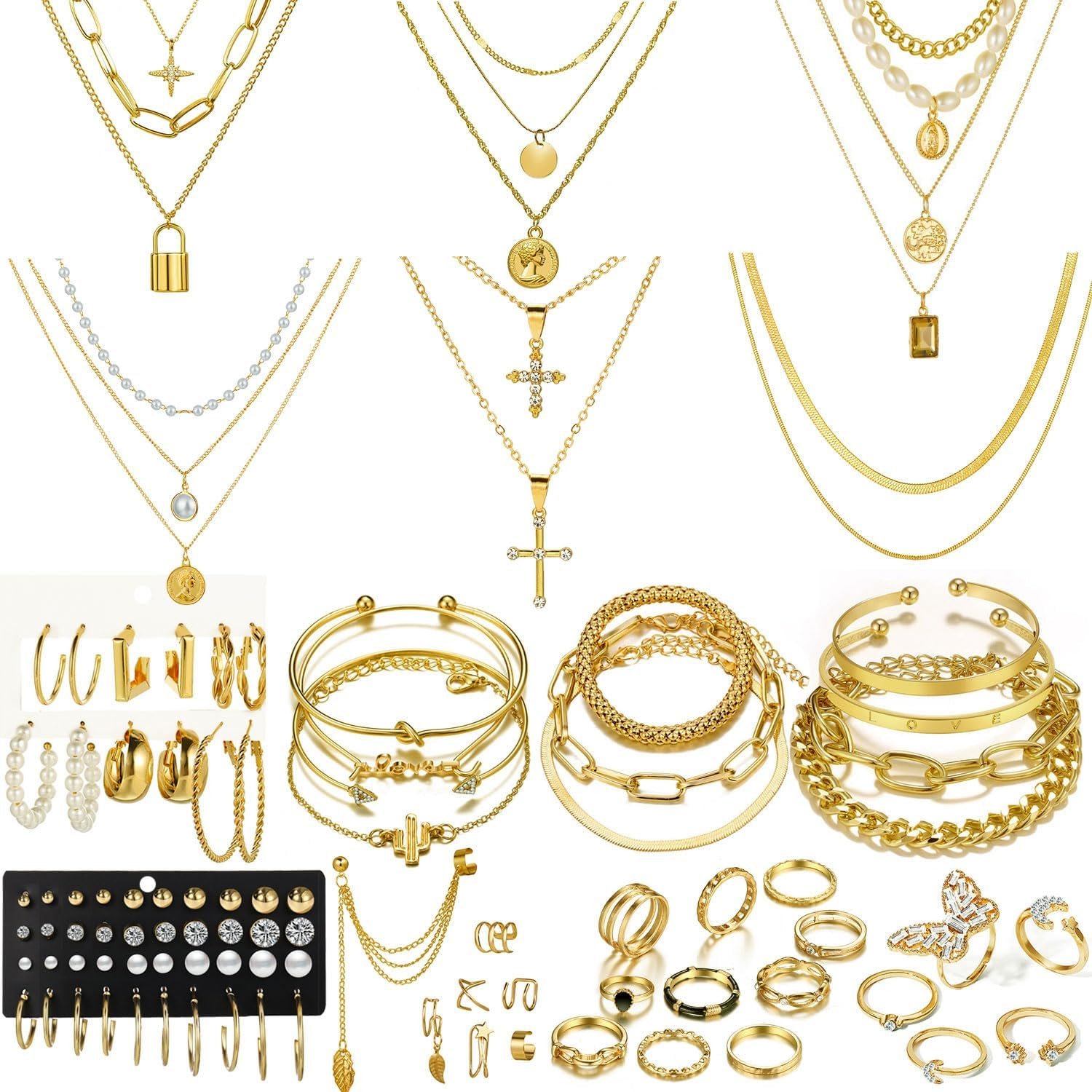 73 Pcs Gold Jewelry Set with 6Pcs Layered Necklace, 11 Pcs anklet and 7Pcs Earring Ear Cuff,12Hoop Earrings ,15pcs Rings,21pcs stud earrings Jewerly set for Women Pack for Friendship Party Gift