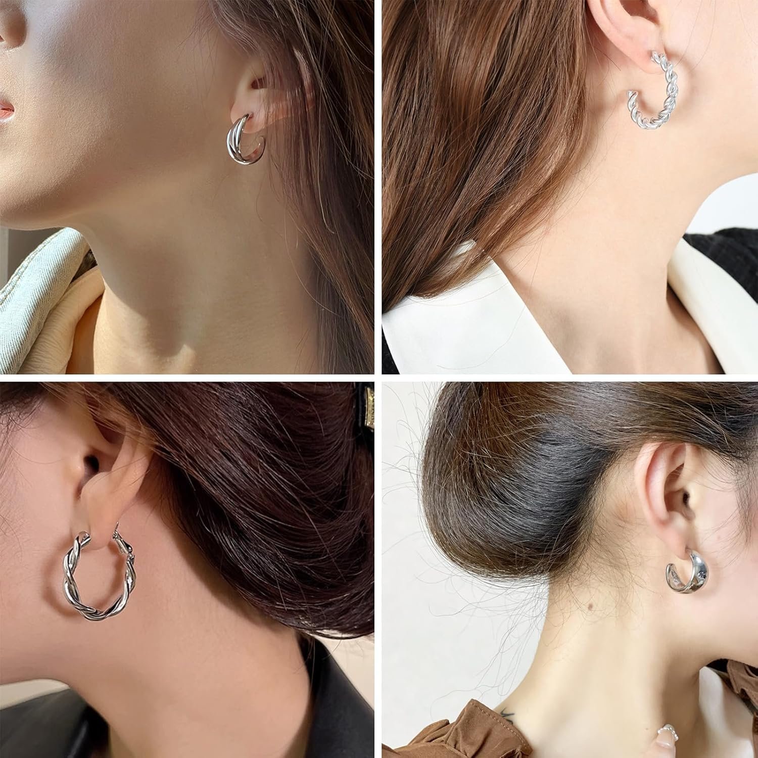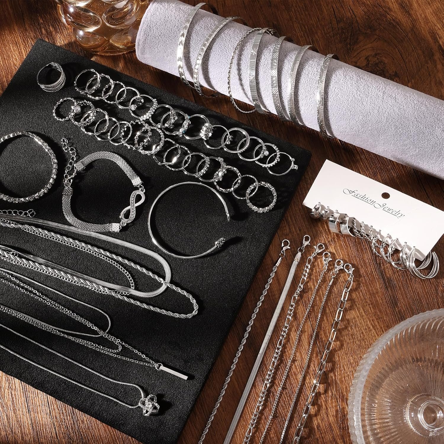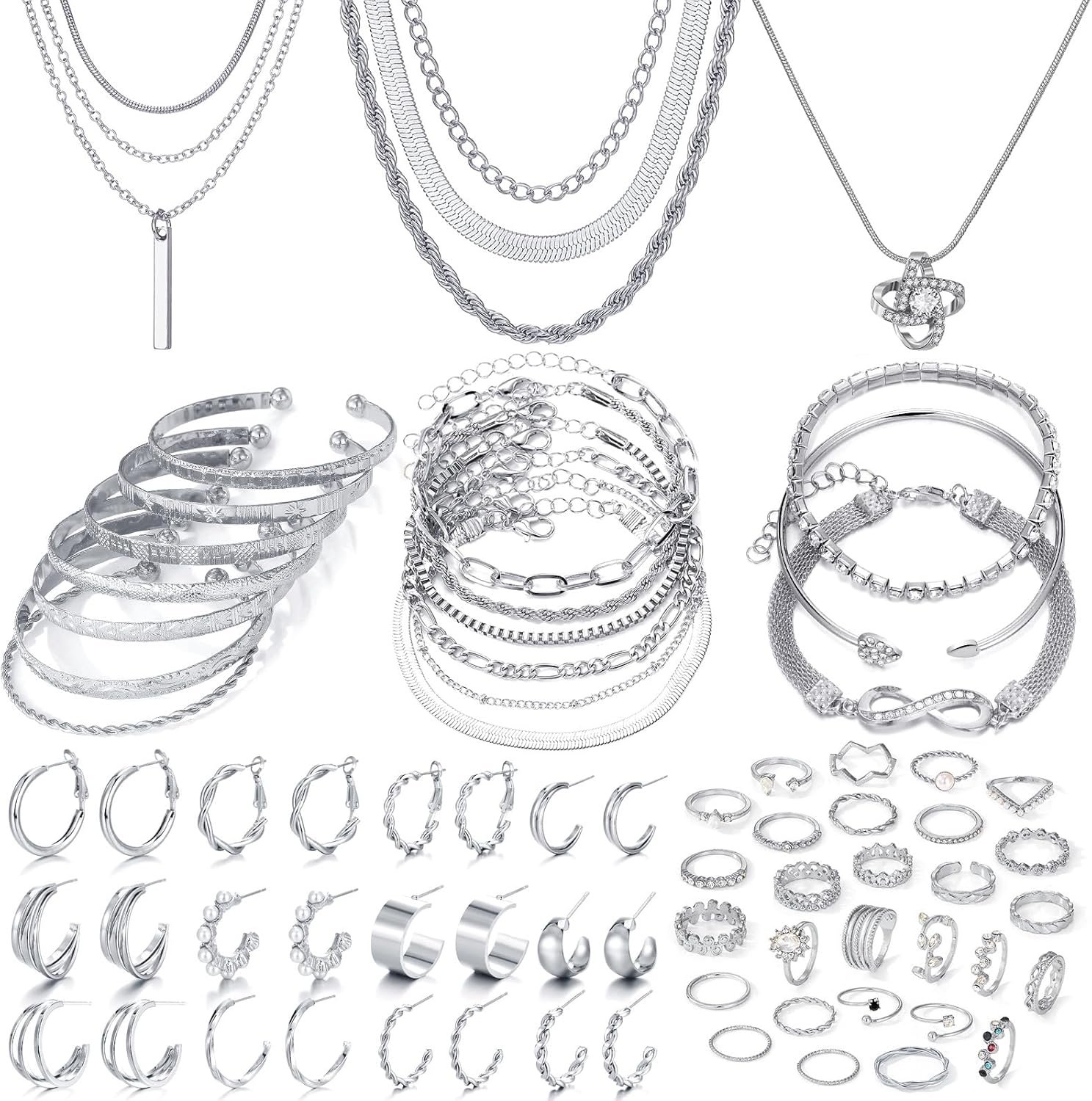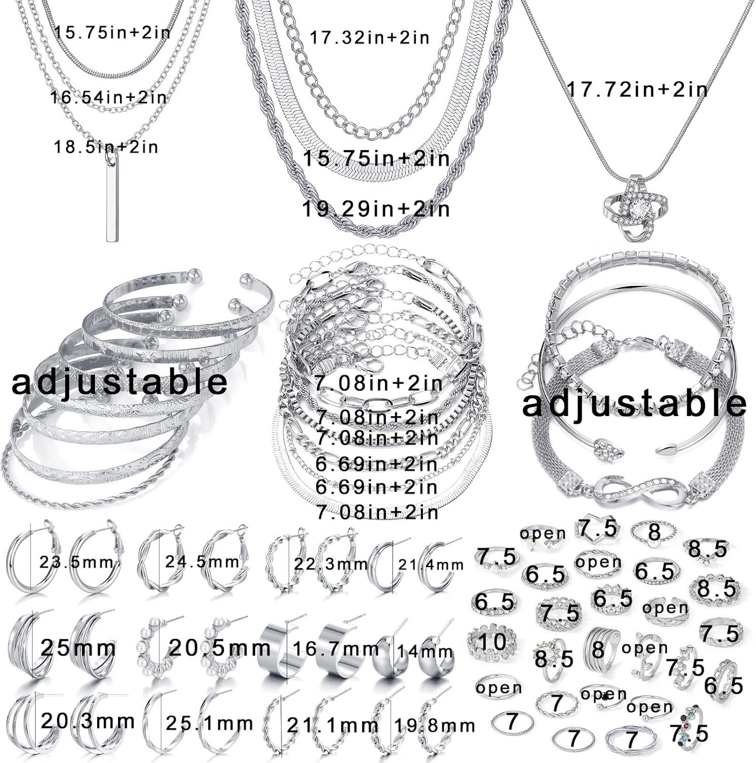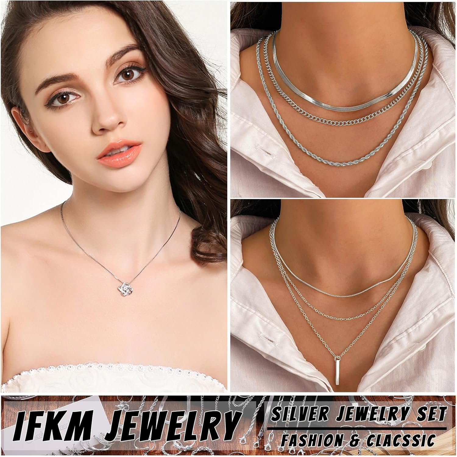 IFKM 36 PC Silver Plated Jewelry Set With 3 Necklace, 12 Bracelet, 7 Ear Cuffs Earring, 14 Knuckle Rings For Women Girls Valentine Anniversary Birthday Friendship Gift