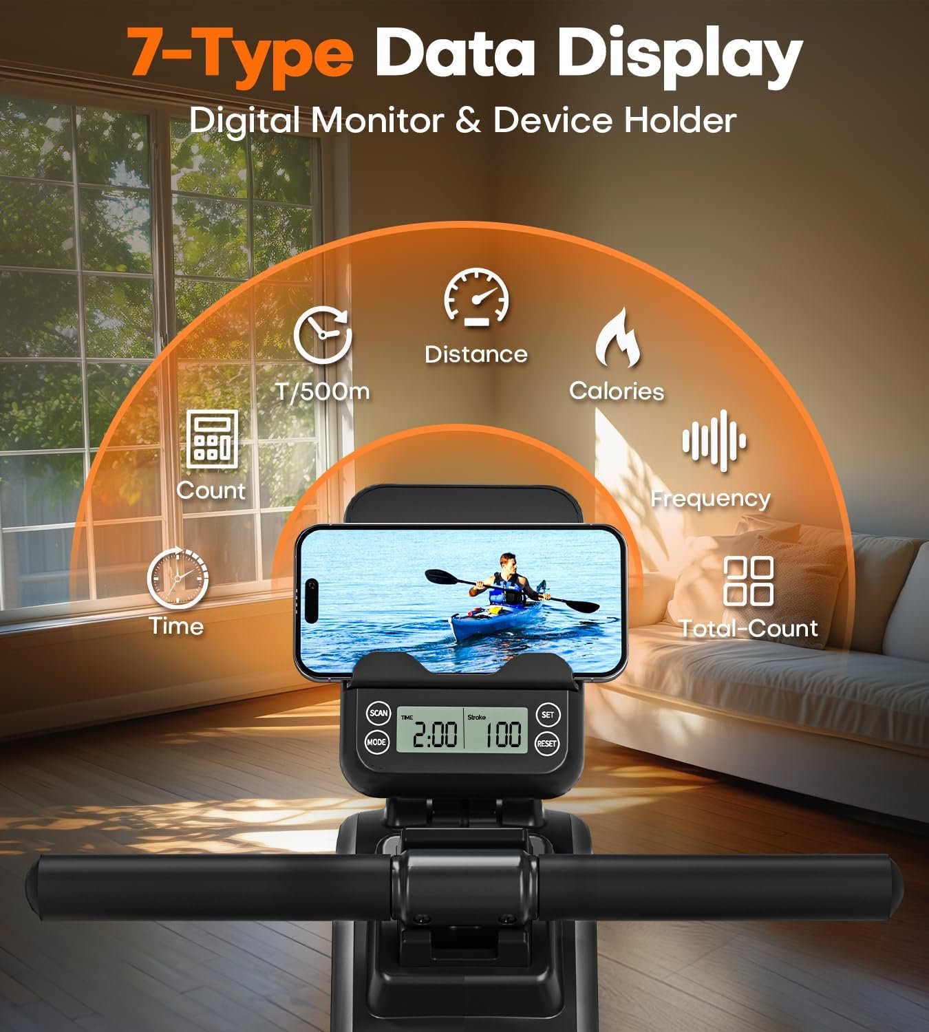 7-Types of Data Disply: The LCD monitor tracks your rowing time, counts, total count, 500 meters in time, frequency, distance, and calories in real time, allowing you to track your progress towards your goals. The device holder lets you place your smartphone and IPAD to enjoy videos or music while using the rower machine.