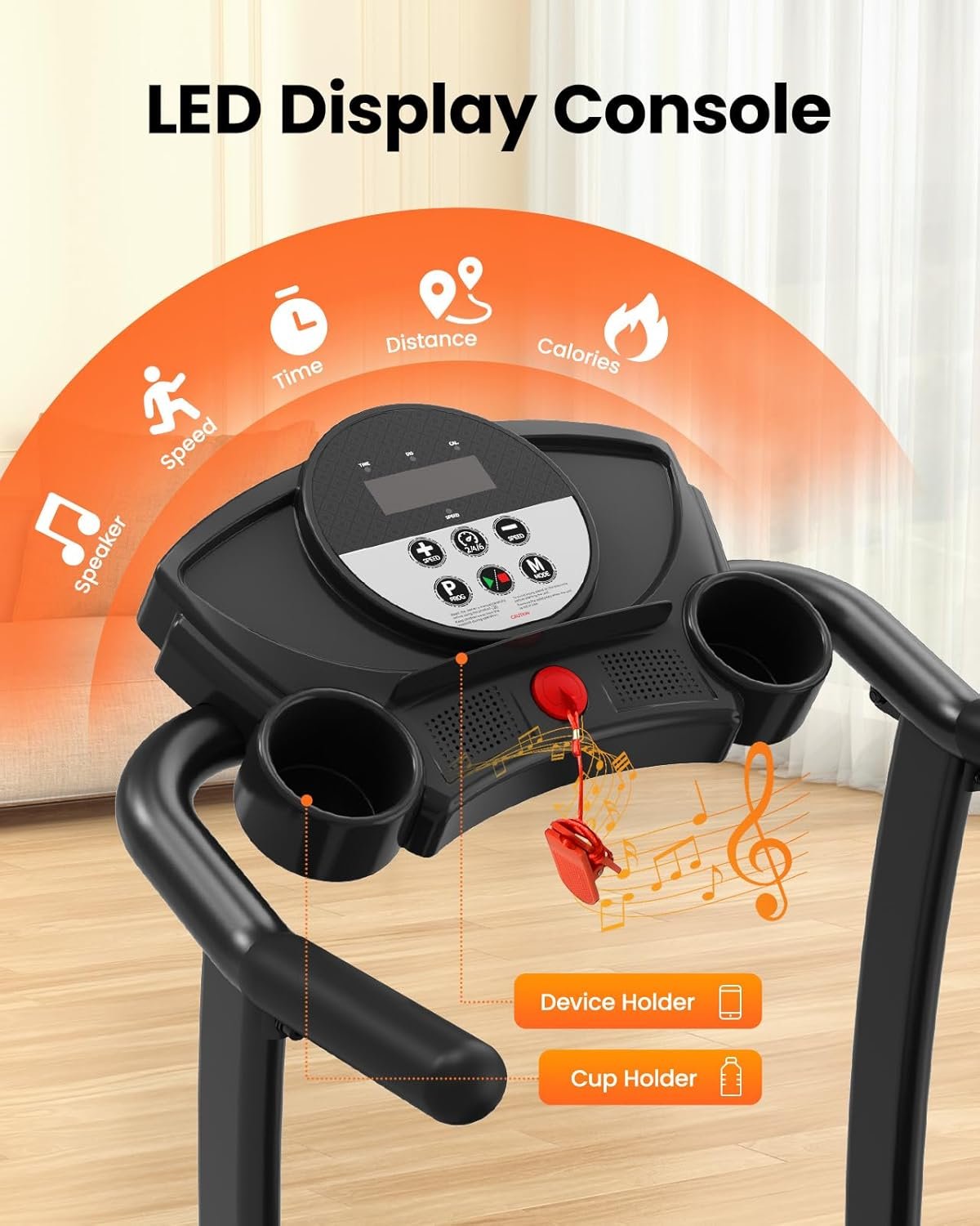 LED DISPLAY CONSOLE: The LED screen of folding treadmill clearly displays time, speed, distance and calories to accurately track your sports performance. Our control panel has knobs to adjust the angle, so you could see the data more easily when you are exercising. 12 preset programs provide different intensities of exercise and you can choose customized one with ease