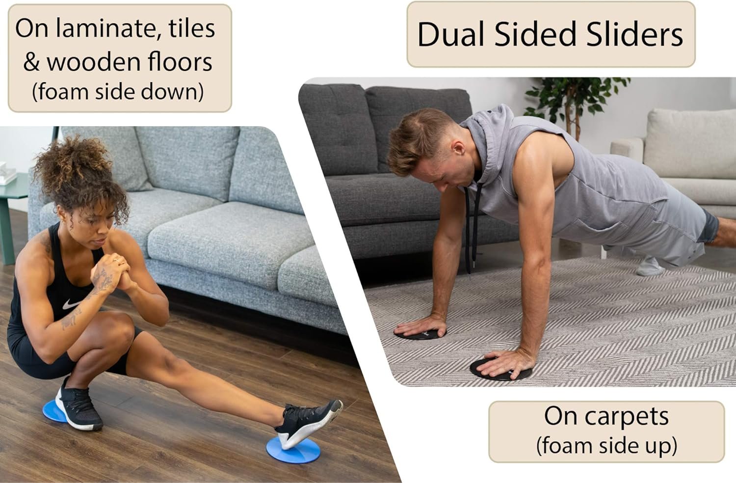 DUAL SIDED: use the foam side down on laminate and hardwood floors or the plastic side down on thin carpets. Did we mention that our workout sliders discs are perfect for the 80 day obsession program? They also keep your joints safe as your feet or hands stay in contact with the floor. Take mountain climbers for instance: your ankles will not receive a shock at every rep when using fitness sliders.