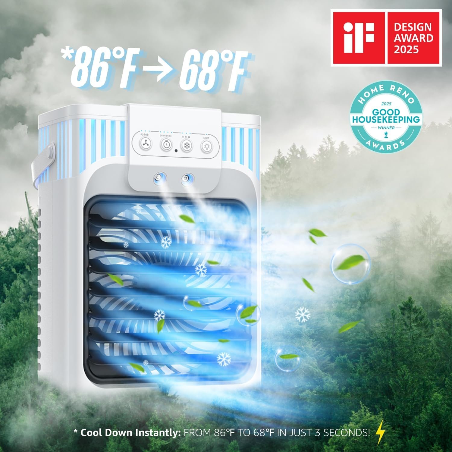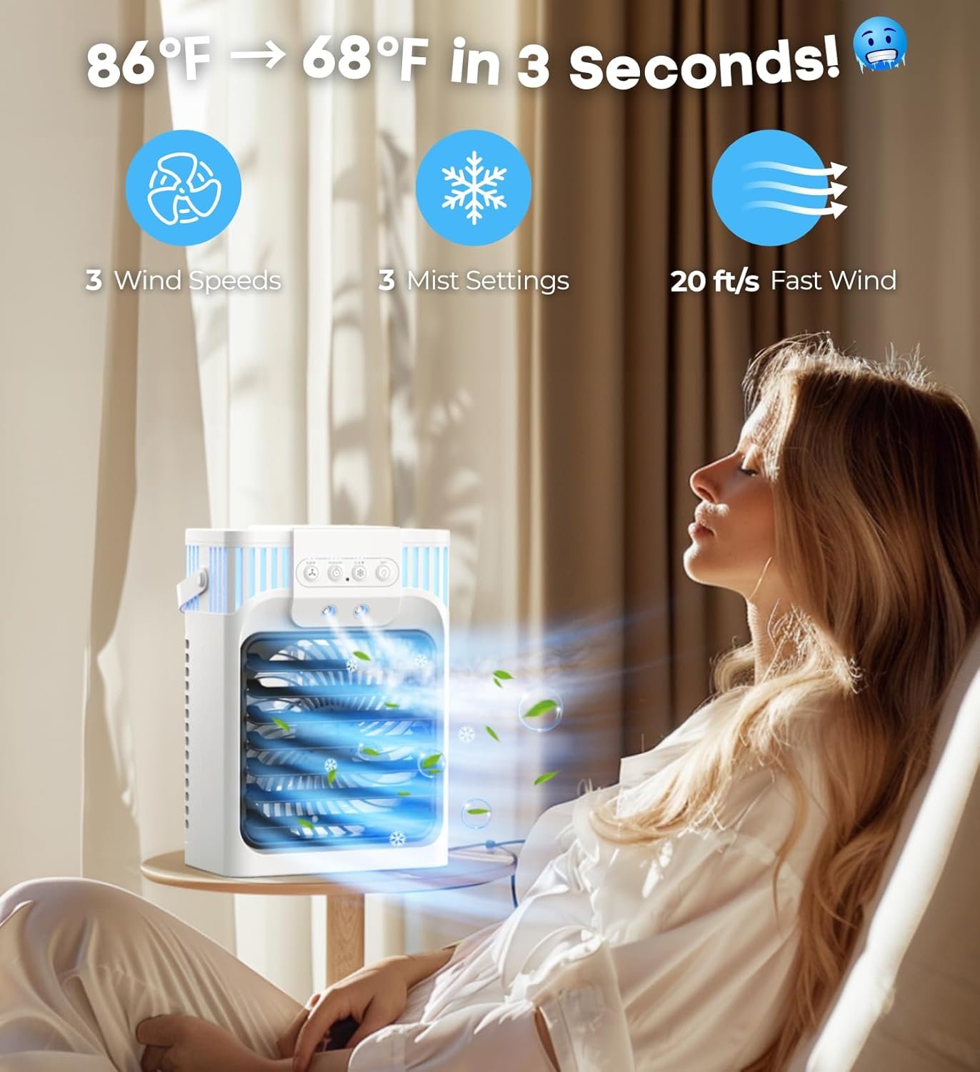 【GET CHILLED IN A FLASH FROM 86℉ → 68℉!】 Our portable air conditioner delivers a powerful chill! Personalize your cooling journey with 3-speed modes (Natural/Med/High) and 3 mist settings (Natural/Low Cool Mist/High Cool Mist). Boasting dual atomizers and cutting-edge triple refrigeration tech, our air conditioner portable creates a revitalizing cooling mist in the blink of an eye. Join over 300,000 satisfied customers who enjoyed refreshing coolness all summer long! This portable ac unit for bedroom will make you wonder why you didn’t find it earlier!