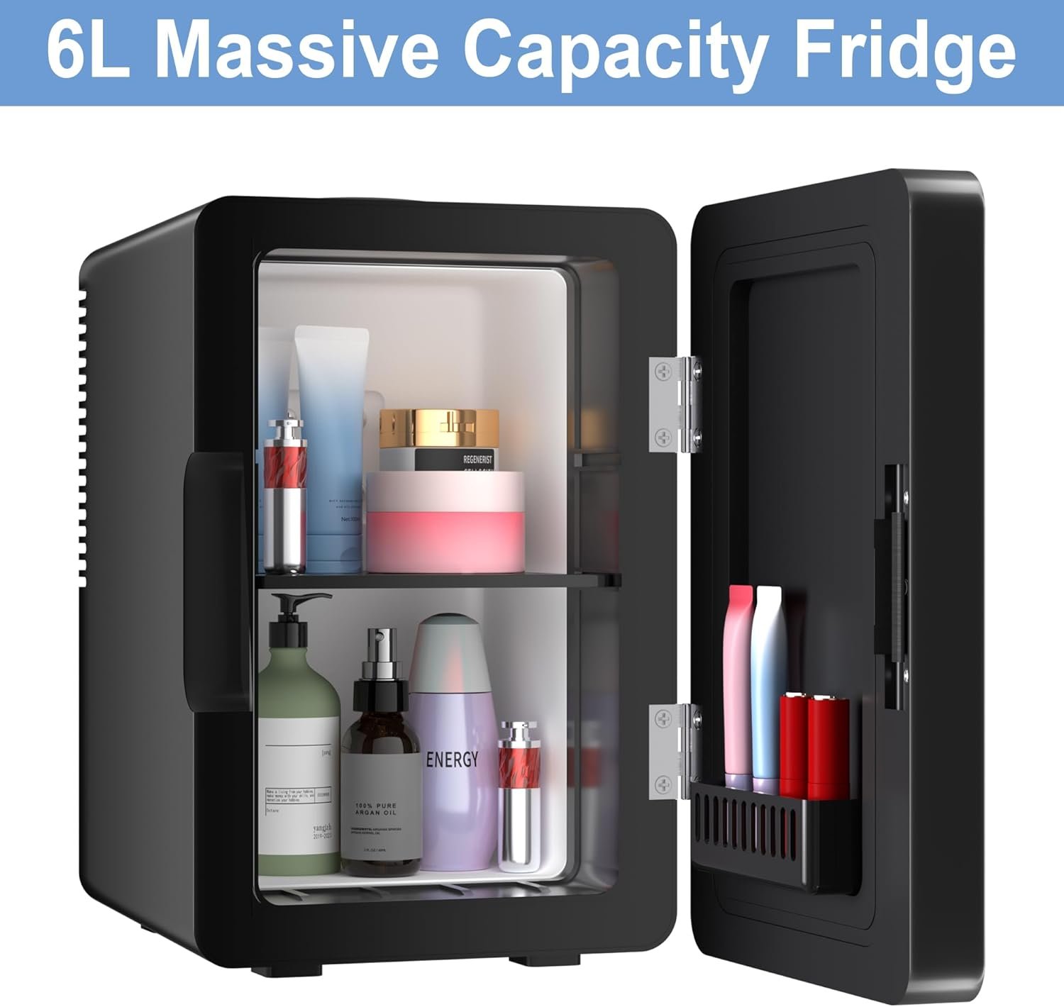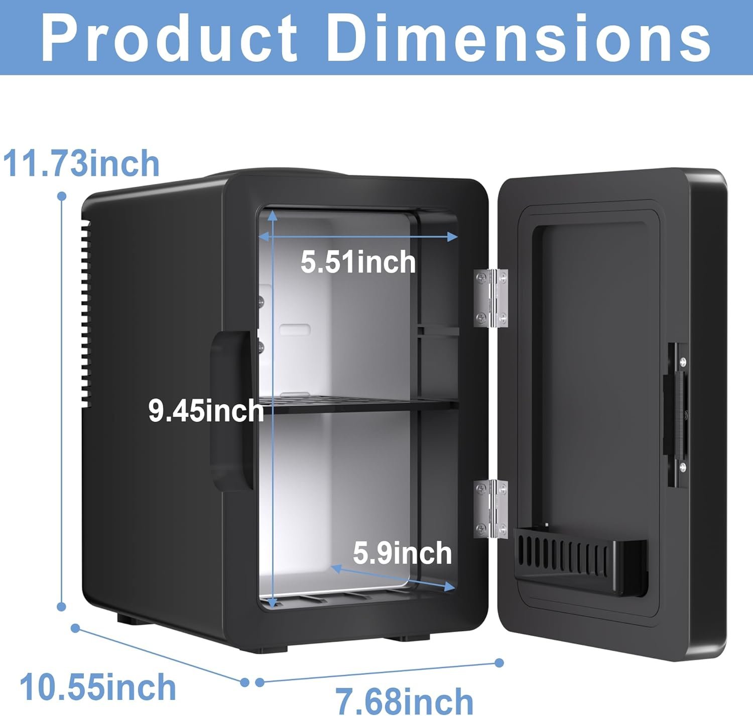Portable Refrigerator: The exterior dimensions of this cosmetic fridge are 10.55” * 7.68” * 11.73”, and the internal dimensions are 5.9” * 5.5” * 9.45”. The personal fridge has a capacity of 6 liters and can easily store 8* 355ml cans or 4* 20oz bottles of water inside.