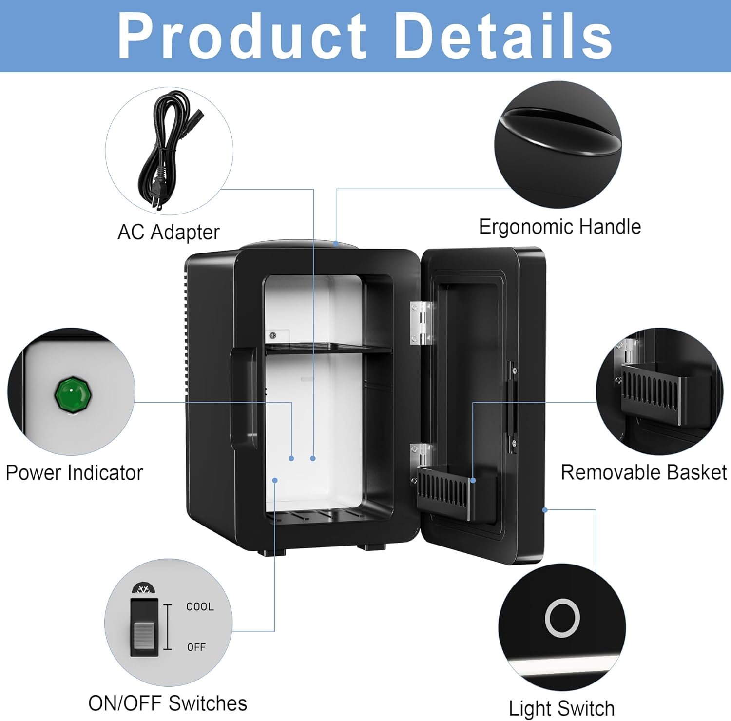 Product Detail: This compact refrigerator has a ON/OFF switch and power indicator light on the back. Carrying handle on the top makes it easy to move or change positions. Ideal for storing cosmetics, fruit snacks, drinks, and medications. NOTE: If the door doesn’t snap shut when closed, press the door to fully secure it.