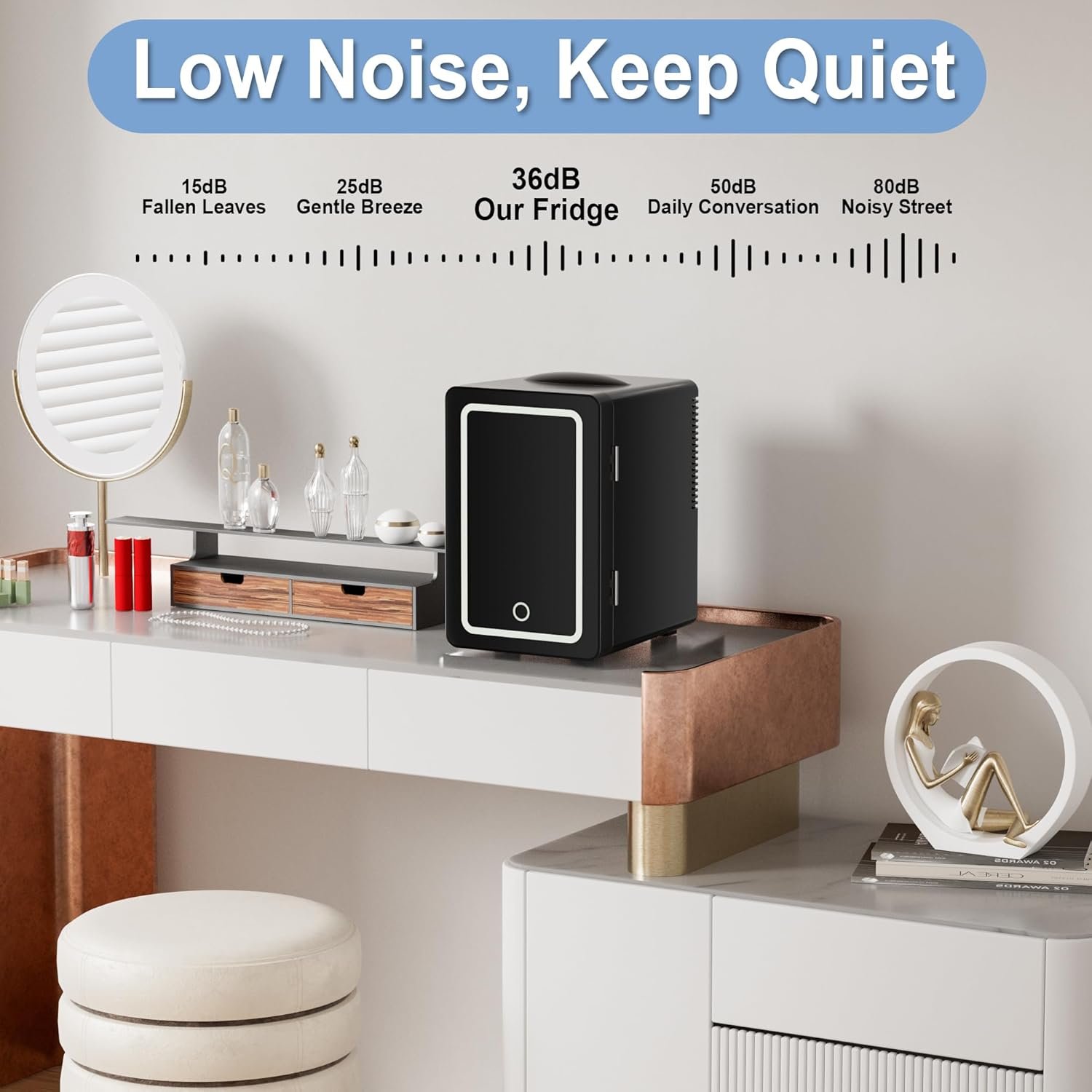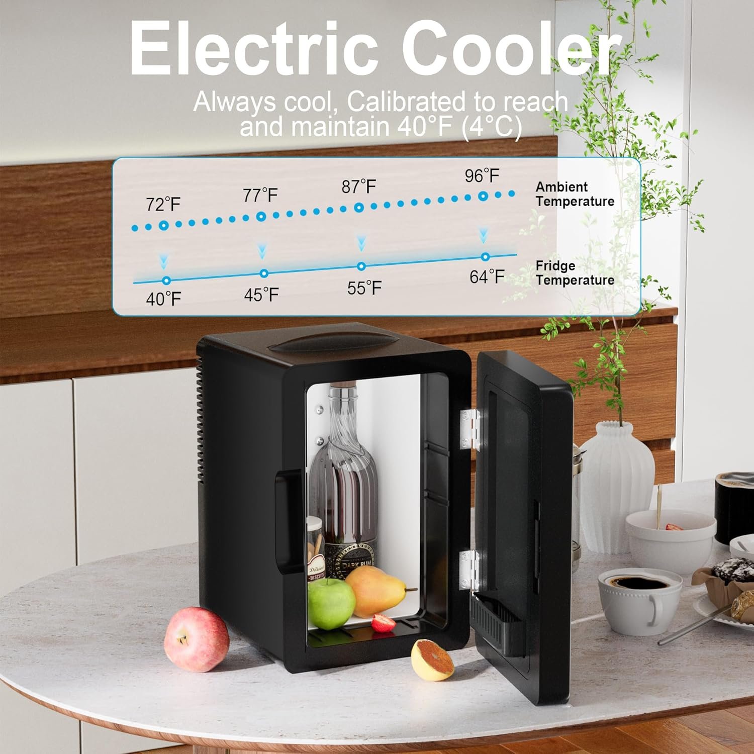 6L Cooling Fridge: This mini refrigerator for skin care and food has a temperature adjustment range of 40°F-64°F(4°C-17°C), always stay cool. An average of 40°F(4°C) is based on 72°F (22°C) indoor room temperature. Calibrated to reach and maintain 40°F(4°C). Not recommended for prolonged storage of perishable items when ambient temperature exceeds 75°F (24°C).