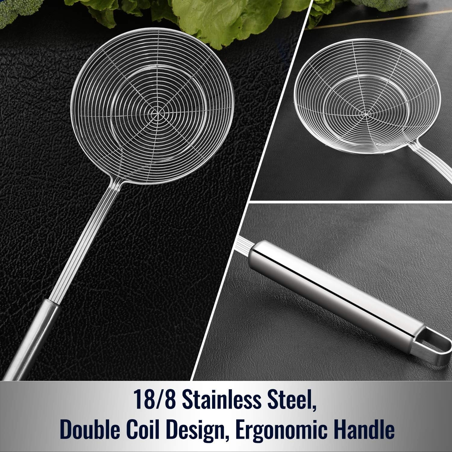 DOUBLE COIL DESIN: The unique design enhances the bearing capacity of the strainer. It is faster than a fine mesh strainer, retains the temperature but leaving little oil or water, No more need to endure high temperature, improving efficiency by quick and massive frying and cooking.