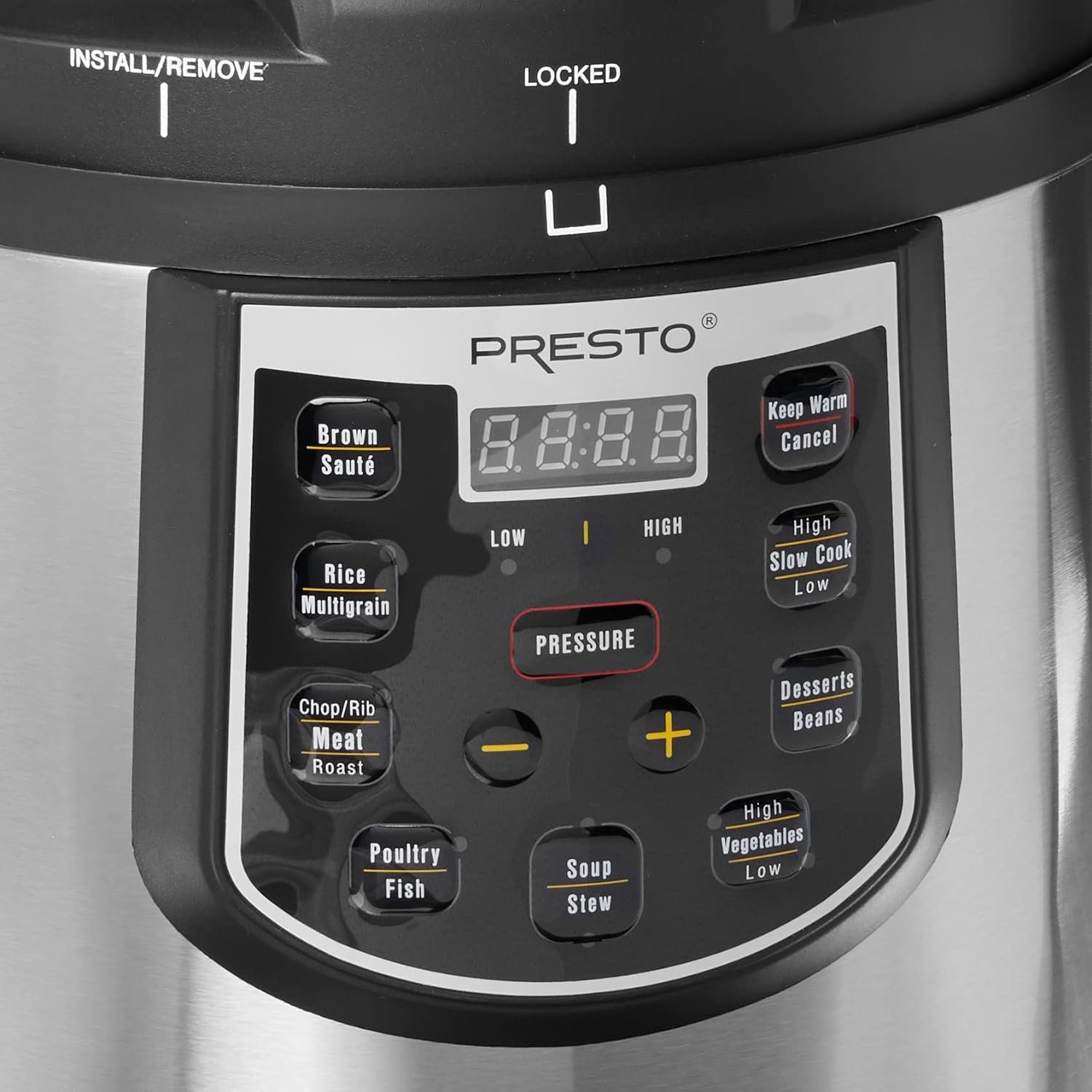 Make healthy, flavorful meals in the Presto® Electric Pressure Cooker Plus, a versatile device that works as both a pressure cooker and a slow cooker in one. Cook meat, fish, chicken, vegetables, beans, rice, grains, even desserts—just set it and the rest is automatic. Choose function settings for high and low pressure, slow cook, brown, sauté, and keep warm. High-speed pressure cooking preserves flavors and nutrients, tenderizes less expensive cuts of meat, and cooks up to 70% faster than ordinary cooking methods, saving both time and money. A special rack is included to use when cooking several foods at once without intermingling flavors. Remove the PFAS-free ceramic nonstick pot for easy cleaning. The Electric Pressure Cooker Plus features 19 programmed settings, including 12 pressure cooking presets, and additional settings for manual programming. All-digital controls and an LED display help set and show the remaining cooking time while in use. It automatically maintains the proper internal pressure, then reduces the pressure naturally and switches to the keep warm function when cooking time is complete. Or, you can manually activate the valve lever for quick pressure release. Cook confidently with eight built-in safety features, including a cover locking system that only allows pressure to build while the cover is securely closed and prevents the cover from being opened until pressure is safely reduced.