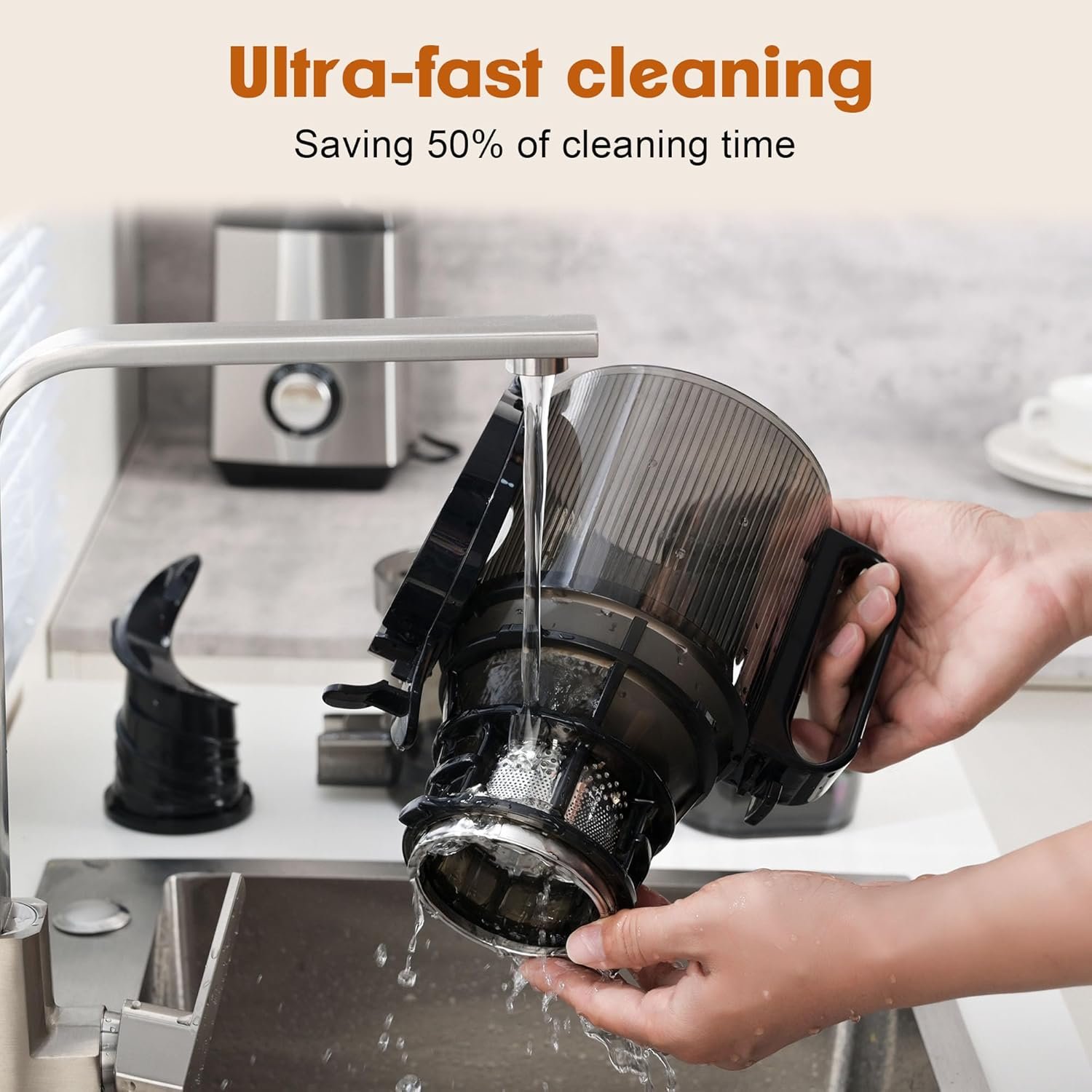 【Extra-Wide Feeding Chute & Hands-Free Juicing】With the Fretta Wide Feed Chute Juicer machine, all you need to do is add your ingredients and start the machine. Thanks to the 140mm wide feed chute, you can directly insert large pieces of ingredients without the need for cutting, significantly reducing preparation time and eliminating the tedious pre-cutting work.