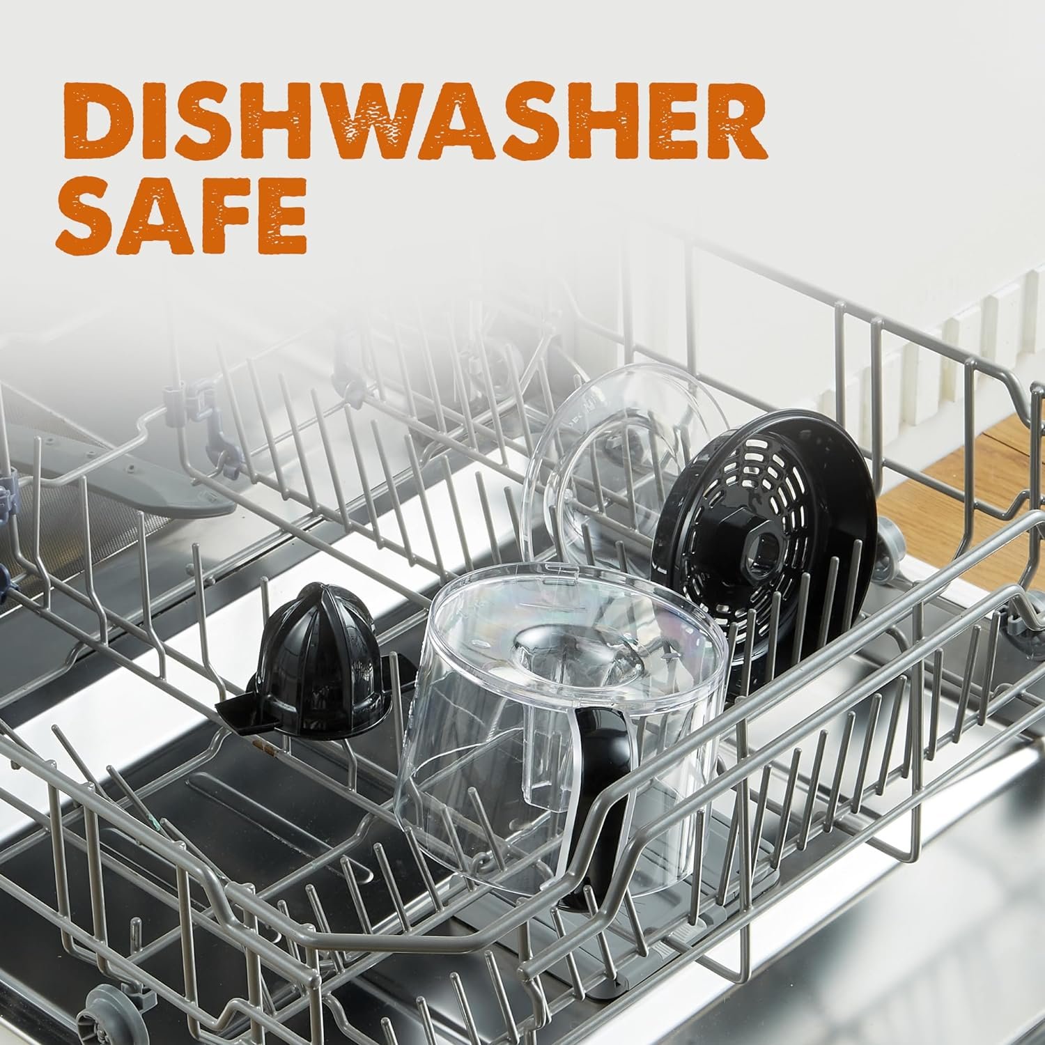24 OUNCE SERVING SIZE: The 24oz (3 cup) capacity is perfect for 2-3 servings of fresh healthy citrus juice, with a convenient pouring spout and handle built right into the juicing container with a strainer/pulp/seed collector. All detachable parts are dishwasher safe.
