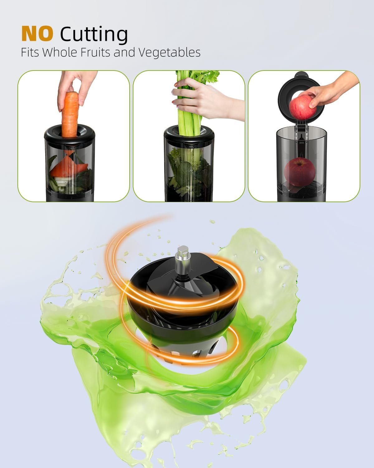 No Cutting-Add whole fruit or veggies to the juicer.