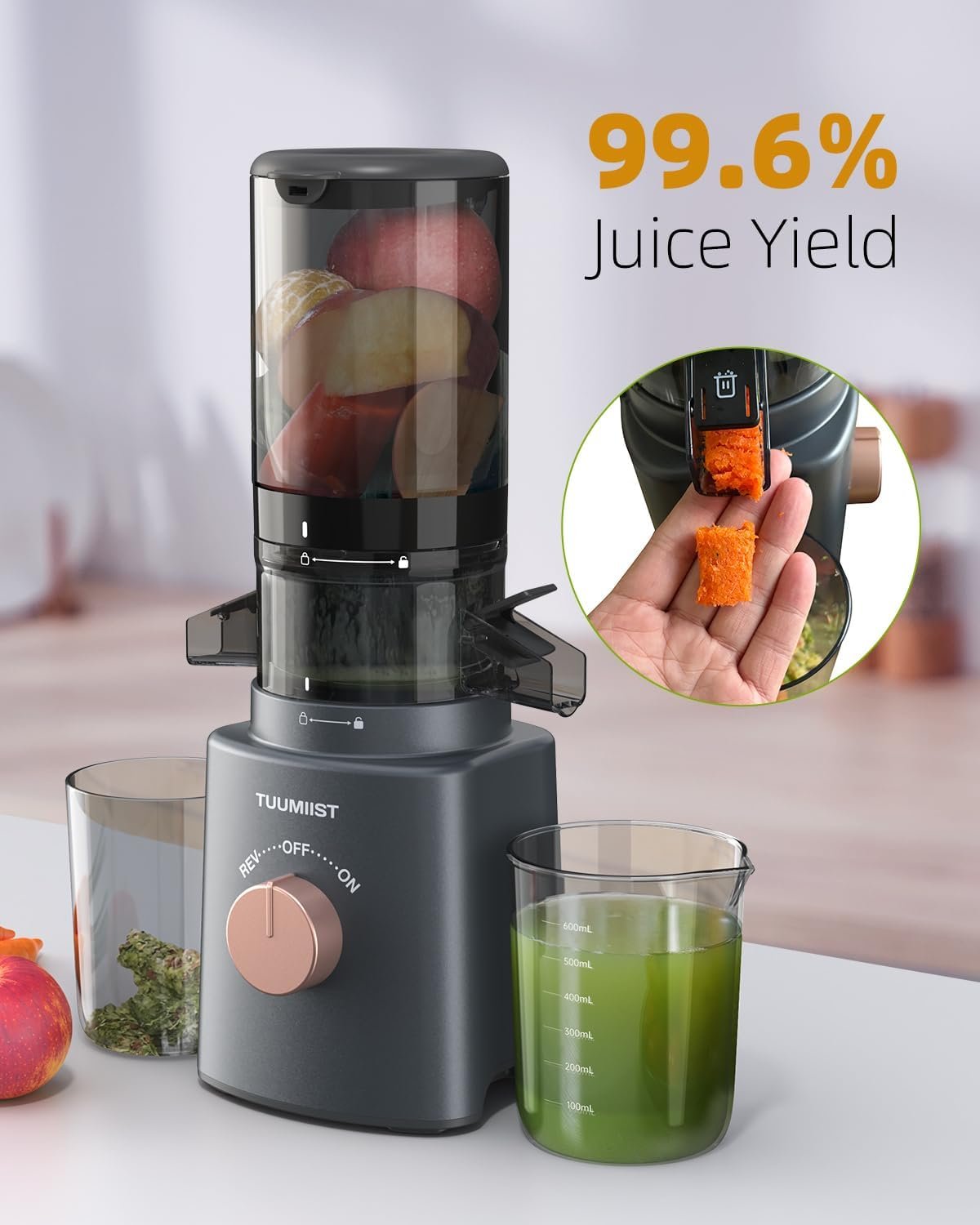 The relatively smaller footprint of a vertical juicer is ideal for kitchens with limited counter space, You can tuck the TUUMIIST juicer into a corner quite easily.