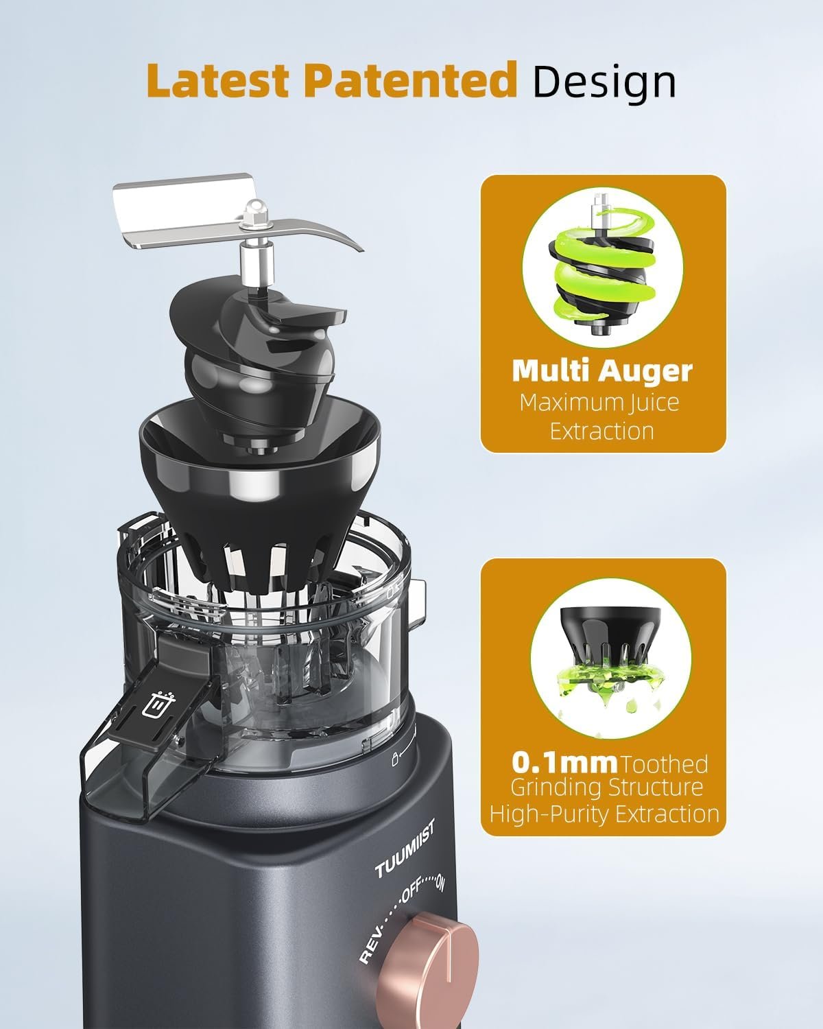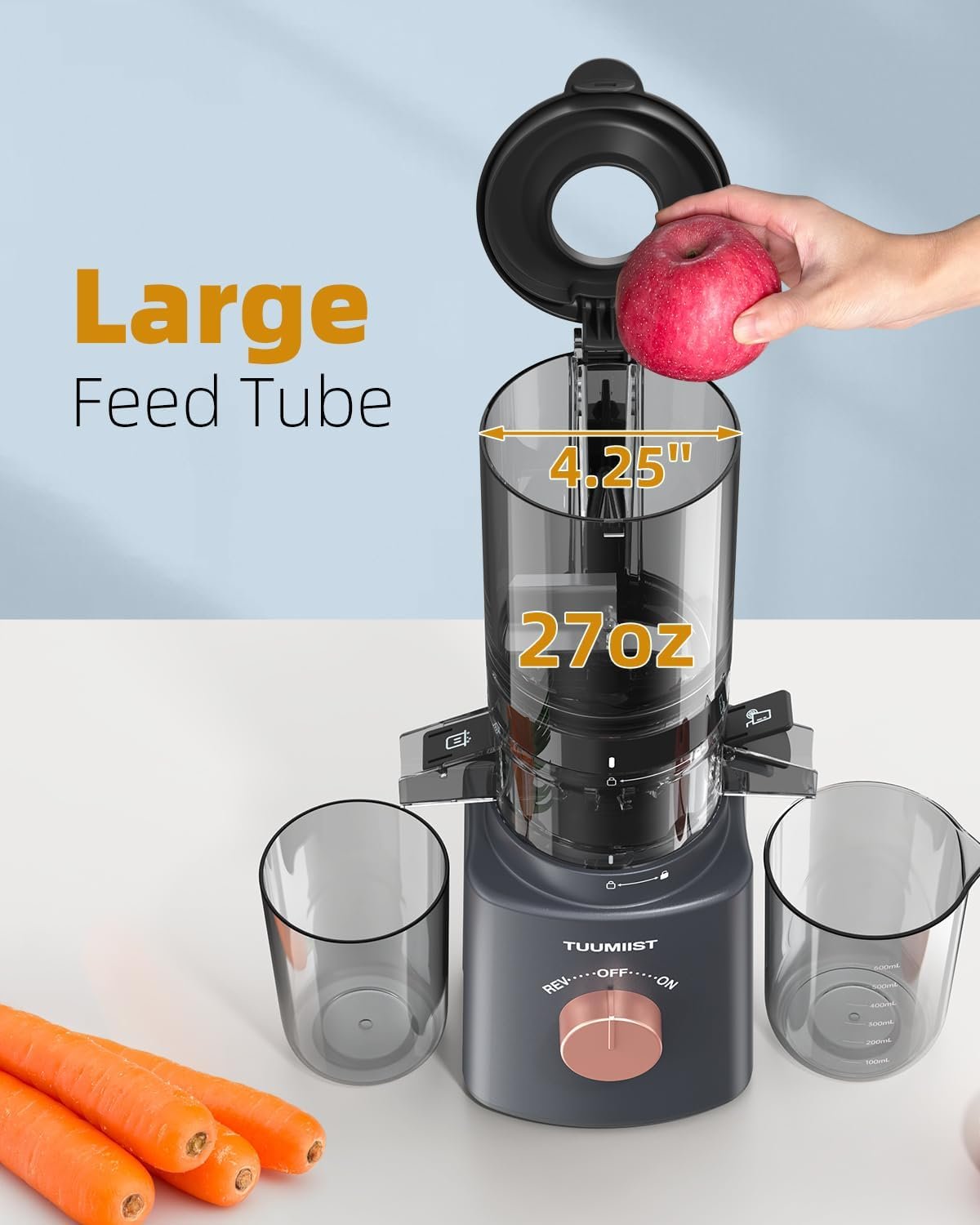Juicer Machines, TUUMIIST Cold Press Juicer with 4.25” Large Feed Chute Fit Whole Vegetable And Fruit, Masticating Juicer Easy To Clean, Gun Grey