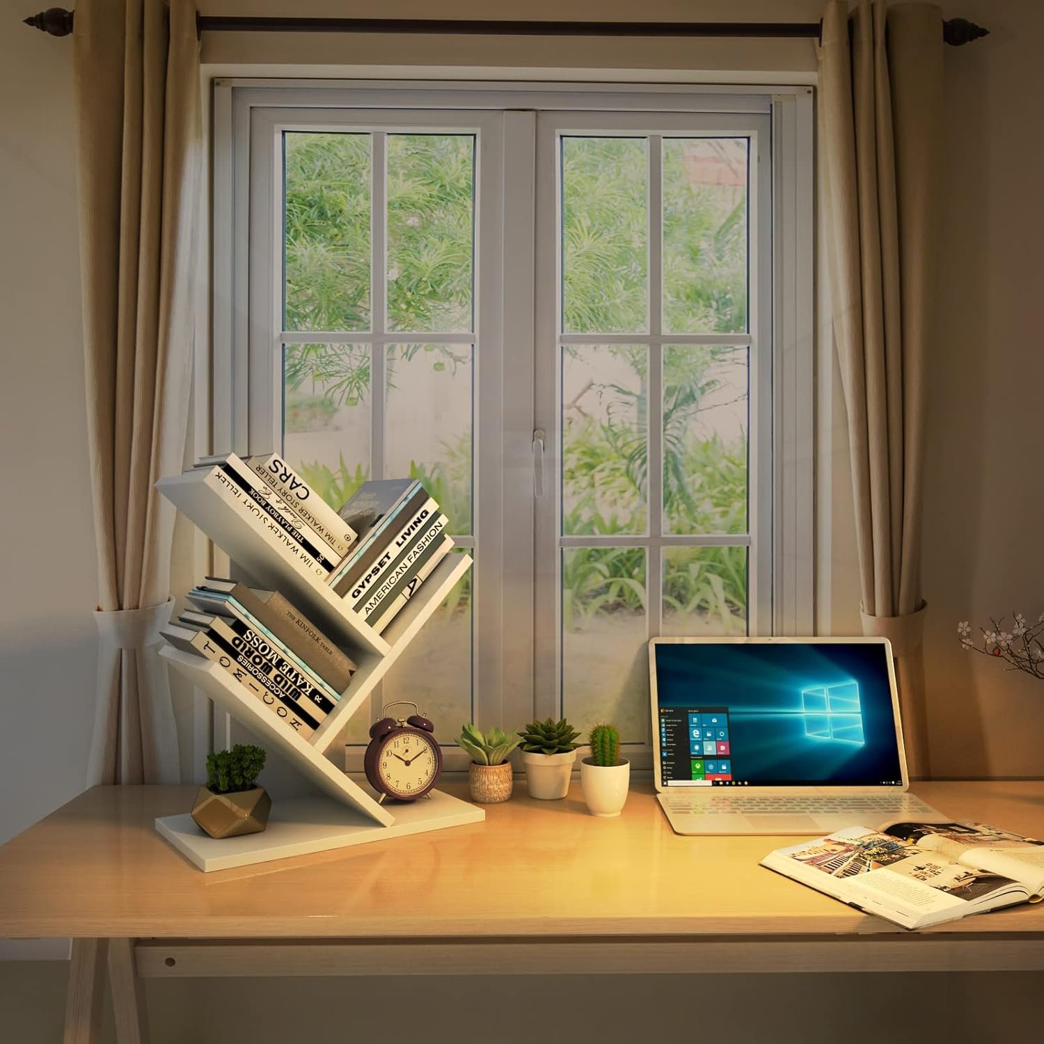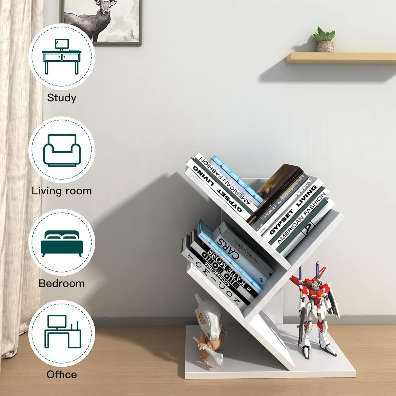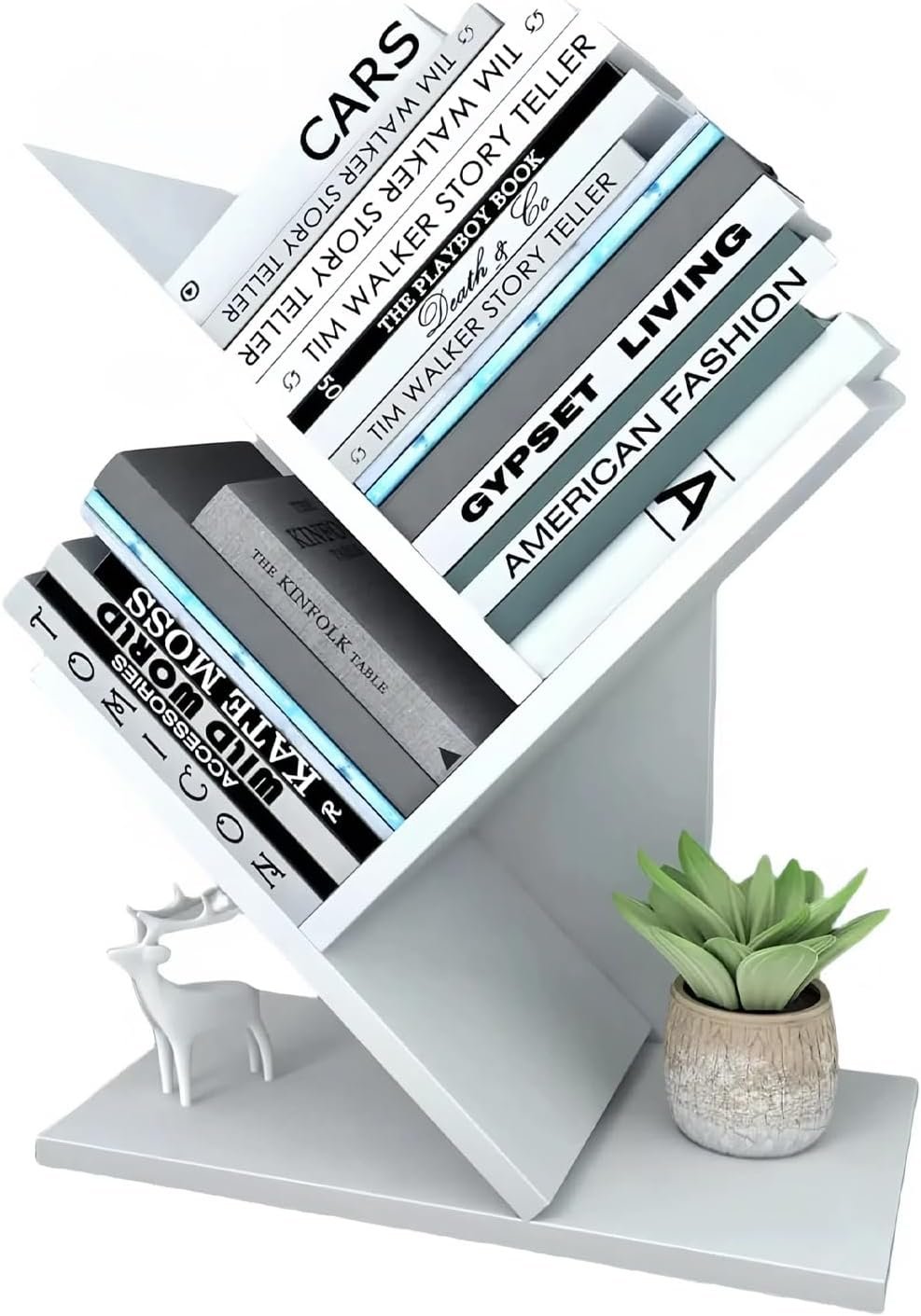 Godferyxin Tree Bookshelf, 3-Tier Wood Mini Bookshelf and Small Bookcase for Office, Home or School Desk Book Shelf for for Displaying Books, CDs, Magazines Wood Storage Rack-Whit