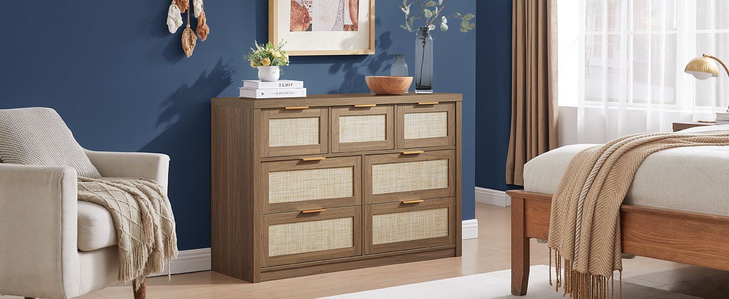Rattan 7 Drawer Dresser: OAKHAM HOME 7 drawer dresser with woven rattan panels and clean lines, it brings the soothing essence of nature into your home. The gentle curves of the rattan strands create an inviting atmosphere, while the metallic handles add a touch of modern elegance. This rattan dresser can be matched with various themed homes
