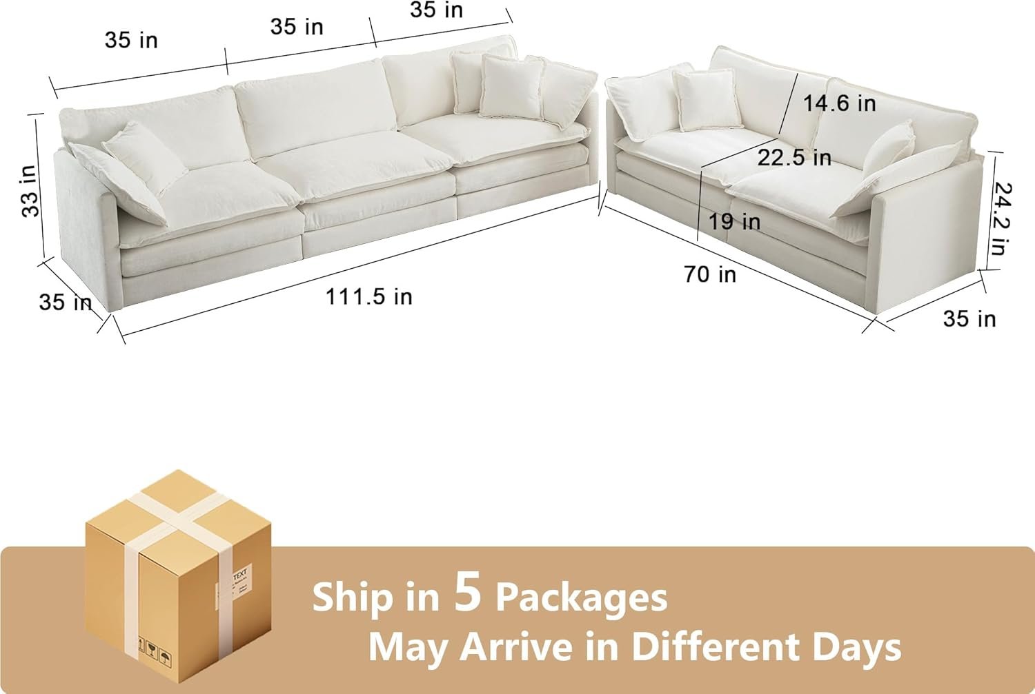 【Dimensions& Assembly】Loveseat size: 76.7″W x 35″D x 33″H. 3 Seater sofa size: 111.5″W x 35″D x 33″H. Enjoy the fun of assembly with your partner! This sofa requires assembly, instructions and tools are included, packages may arrive separately within a few days.