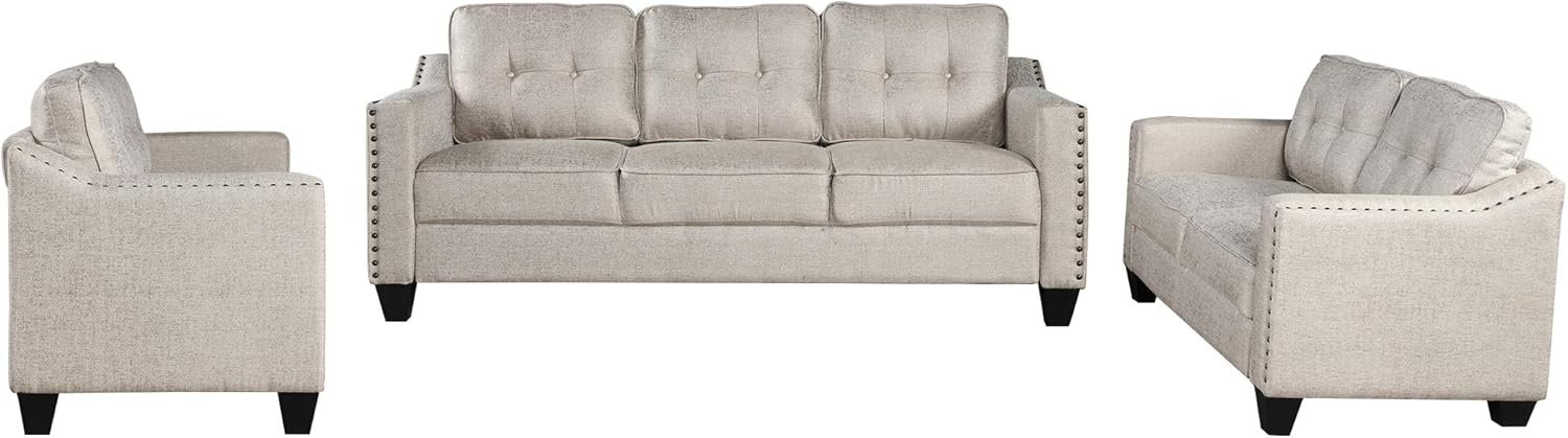 ️ This 3 piece sectional sofa set includes a 3-seat sofa, loveseat and armchair, capable of fitting up to six adults comfortably. Contemporary design is merged with fashion allure with the elegant silhouette paired with the decorative nail head trim detailing. With a simple but modern style, enjoy having a touch of graceful charm to your living space. This set is available in two rich upholstery tones to select. Thick padded set and back cushions feature fabric piping and dimpled tufting, providing both a polished appearance and heightened comfort. Crafted with a solid wood frame, this set is sure to serve your family for an extended period of time.