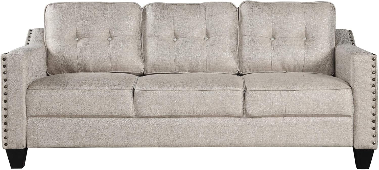 [Contemporary Style]The perfect pick for meeting your aesthetic needs, this set features a contemporary look and a streamlined silhouette. The brass nail head trip tastefully line the edges while the gilded patterned fabric offers a natural sheen featuring button tufted back cushions for a polished accent.