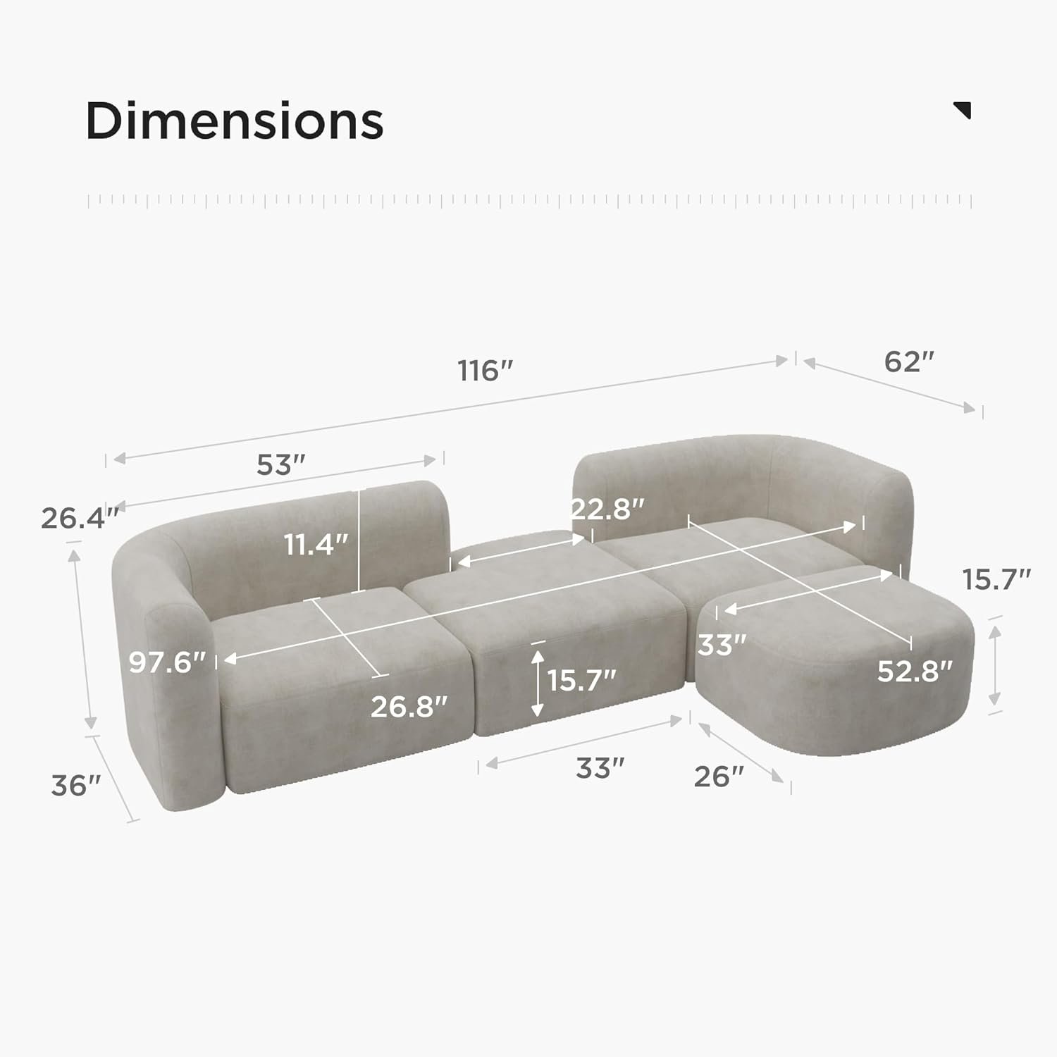 Spacious seating – With a capacity of 1200 lbs, this modern reversible sofa set includes two arm seaters, a middle ottoman sofa, and an ottoman, providing spacious seating for up to 4 adults. It measures 116”W x 62”D x 26.4”H.