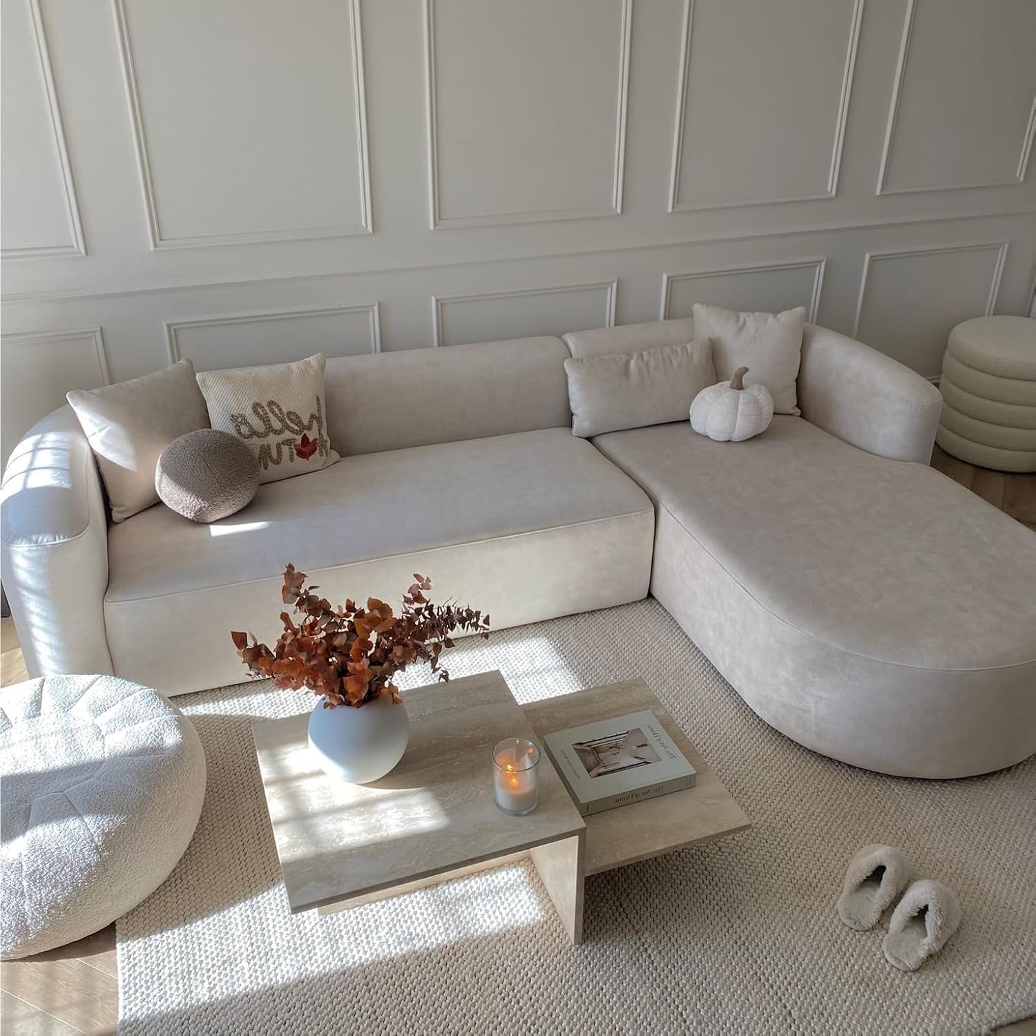 Acanva Luxury Modern Tight Curved Back Velvet Sofa, Minimalist Style Comfy Couch for Living Room Apartment, L-Shape Right Chaise, Cream