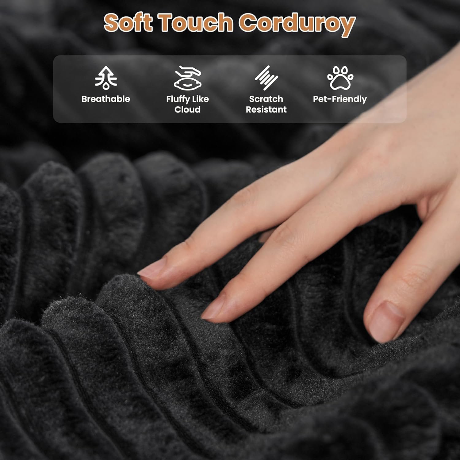 Cloud Plush Corduroy: Exquisite and luxurious plush corduroy fabric offers constant softness and comfort, with its unique cloud-like fluffy texture and luster standing out. Don’t worry if your pet likes to paw at the sofa, the plush corduroy fabric is anti-scratch and can easily allow you to remove clumps of hair