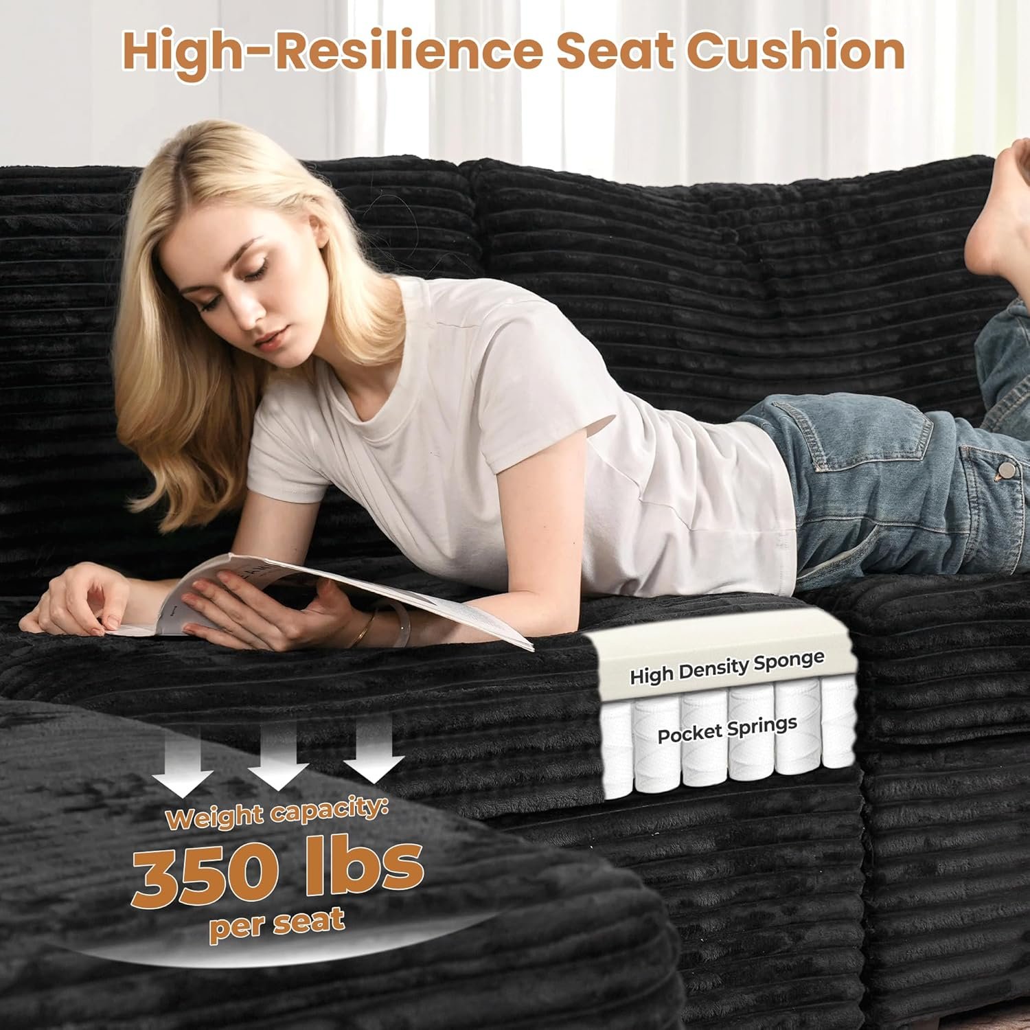 Sturdy Durable Construction: The comfy sofa couch chaise crafted with durable, breathable and high resilience supportive sponge and spring-packed for greater relaxation and comfort. The seats are just right, not too soft and not too firm. Its sturdy hardwood frame supports up to 380 pounds per seat