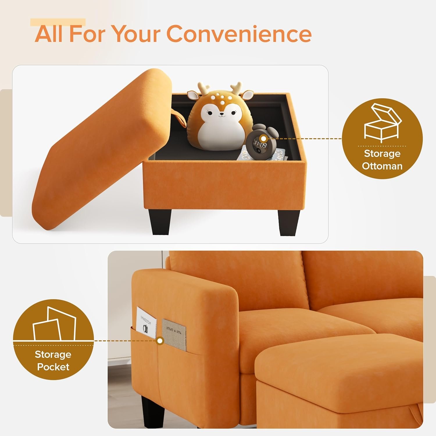 ZeeFu Convertible Sectional Sofa Couch,Classic 3 Seat L-Shaped Sofa Set with Movable Ottoman, Modern Orange Velvet Upholstered Small Sectional Sofa Couch for Small Space Apartment Living Room Office