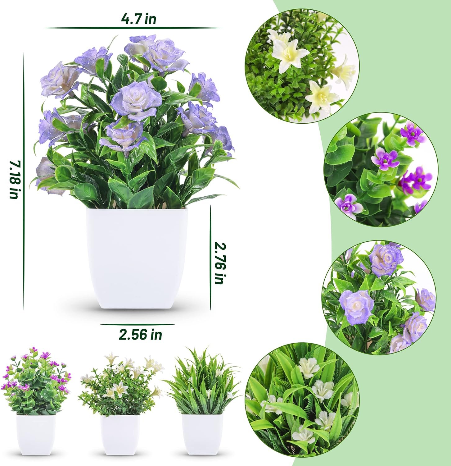 Size&Quantity: Contains four fake potted plants with flowers, each plant is 7.18″ tall and 4.7″ wide, and the pot is 2.76″ tall and 2.56″ wide