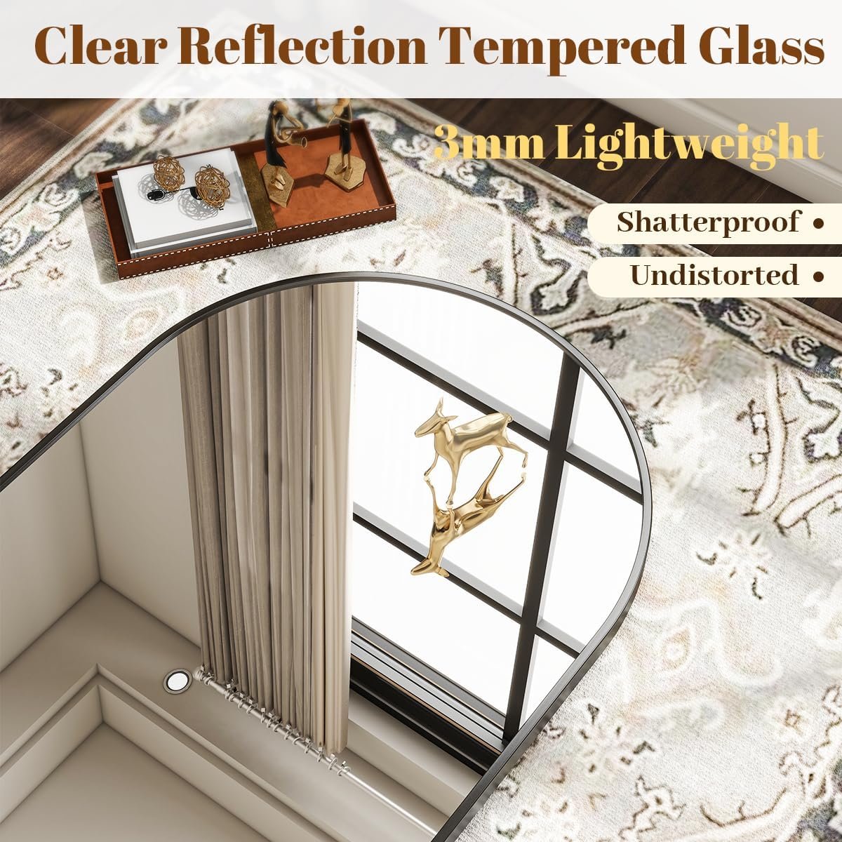 Sturdy Glass: The arched bathroom mirror made of tempered glass will not distort the image at any angle. Most importantly, the improved glass is sturdy and not easily broken into sharp fragments