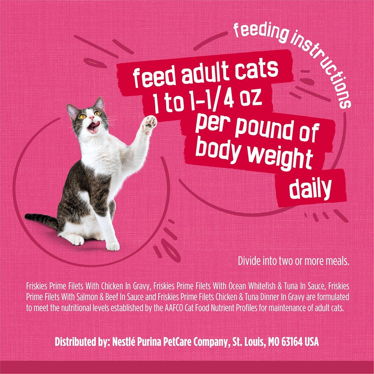 Friskies Prime Filets wet cat food made with real meat, poultry or seafood. Savory sauce or gravy for cats adds flavor and moisture