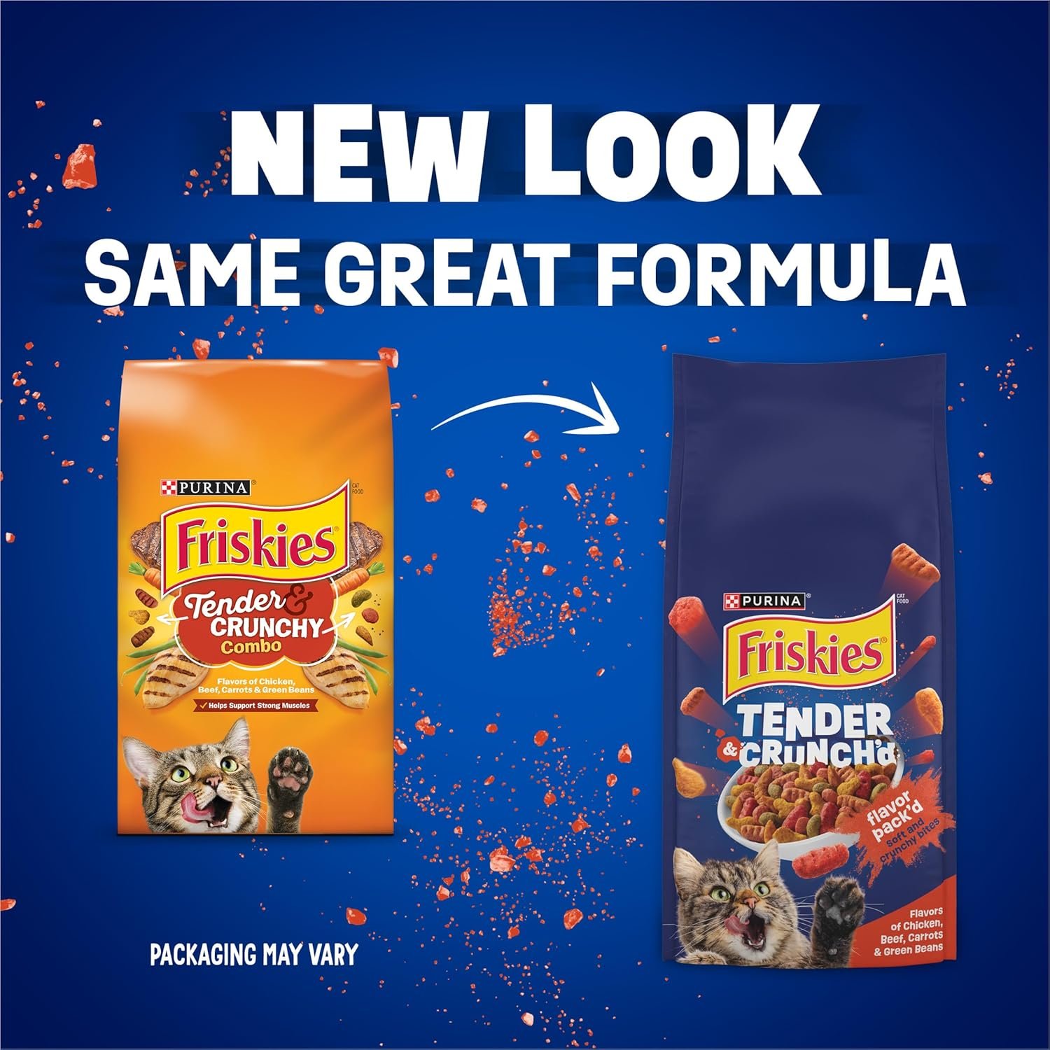 Give your cat a reason for happy meows when you add Purina Friskies Tender and Crunchy Combo dry adult cat food to her daily feeding regimen. Meaty tenders and crunchy bits give her more to love in every bite, and the pleasing shapes get her excited to nibble her way to bliss-filled satiety. This cat food with flavors of real chicken lets you feel good about giving your cat a high-quality meal, and the combination of chicken and beef flavors accented with garden veggies delivers the taste cats crave. With 100 percent complete and balanced nutrition for adult cats, this formula features protein to support her strong muscles, taurine and vitamin A for healthy vision and antioxidants to promote the health of her immune system. Let her come running as she hears the sound of the delectable morsels filling her bowl, and watch as she delights in every bite. With so much yummy goodness, this dry kibble cat food satisfies her hunger and shows her how much you care.