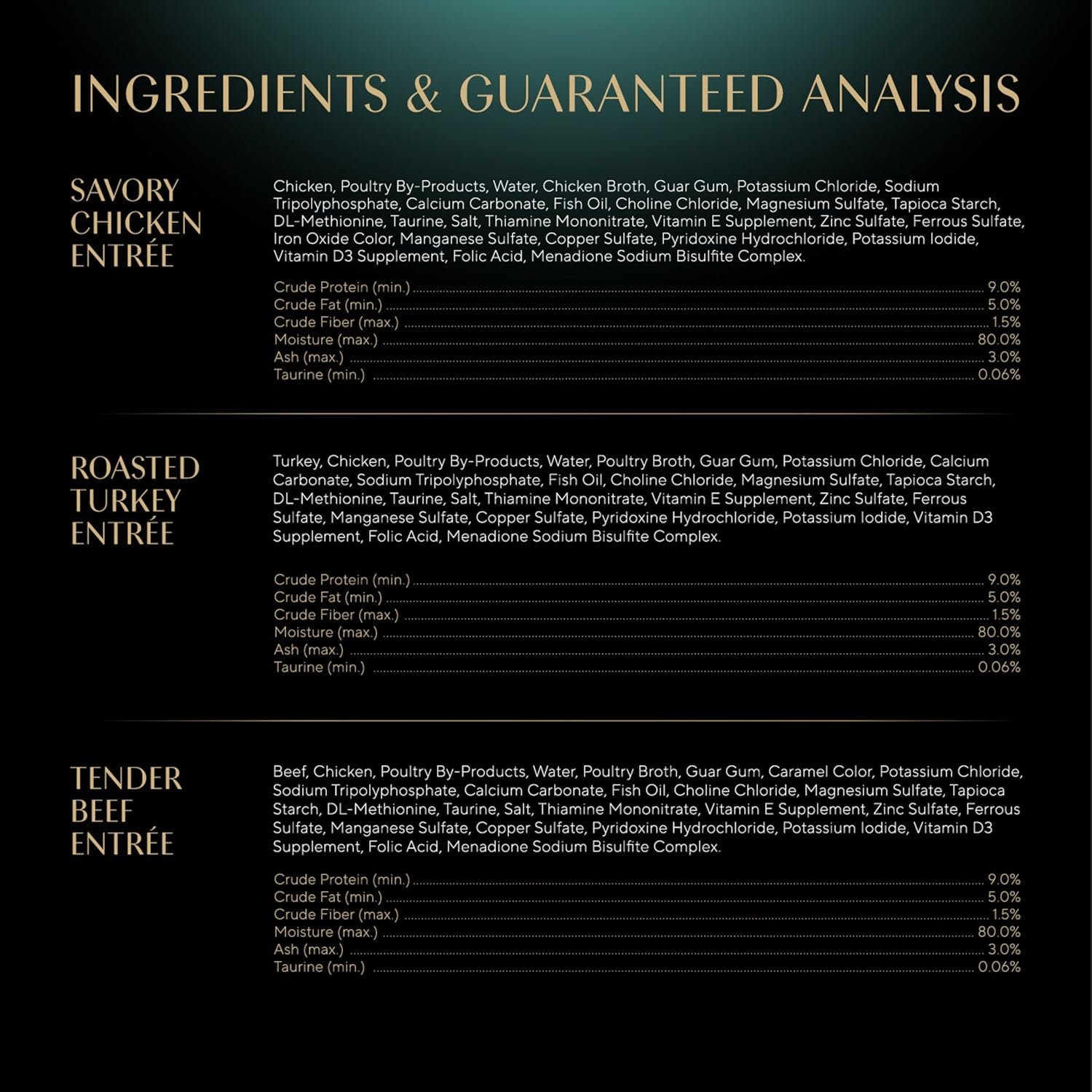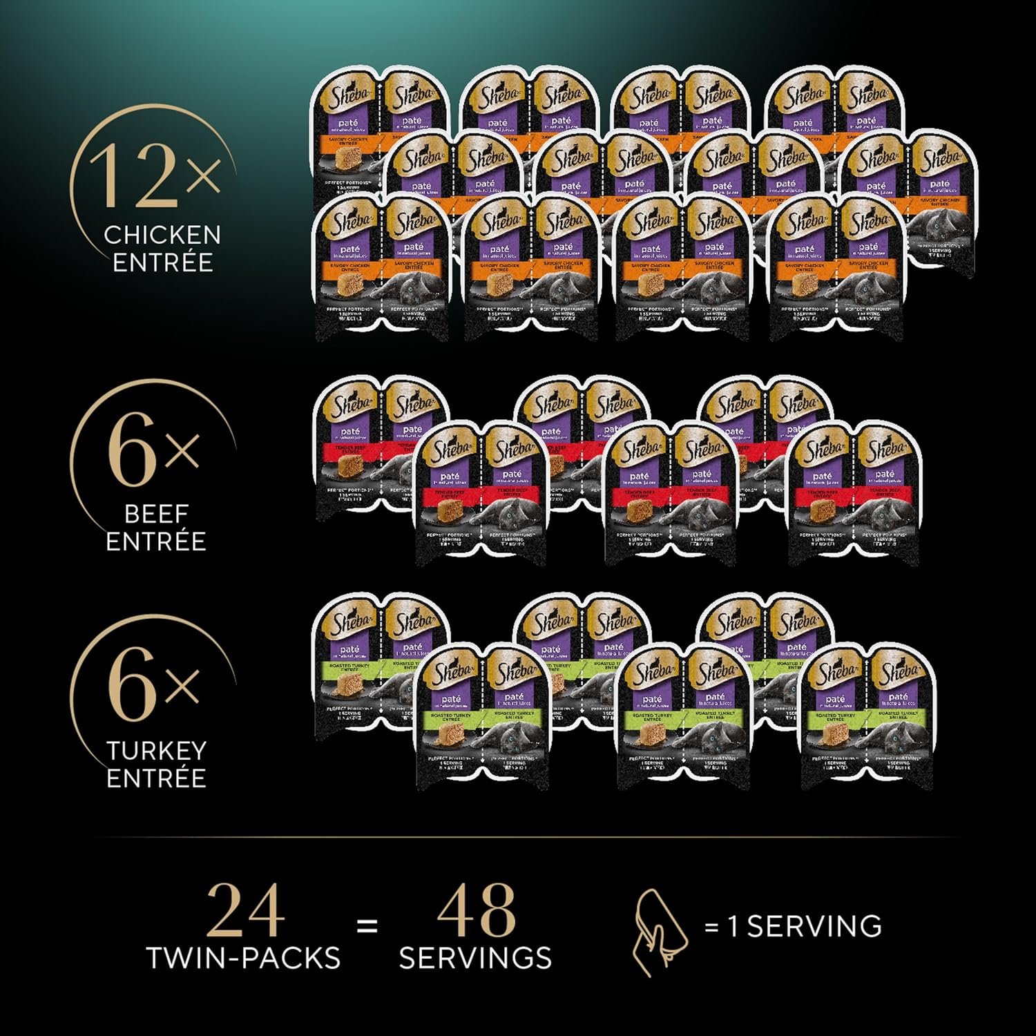 Variety Pack: Contains twenty-four (24) 2.6 oz. twin-pack trays (48 servings total) of Sheba Perfect Portions Wet Cat Food Pate Variety Pack: (12) Savory Chicken Entree, (6) Roasted Turkey Entree, (6) Tender Beef Entree (24 Count, 48 Servings).