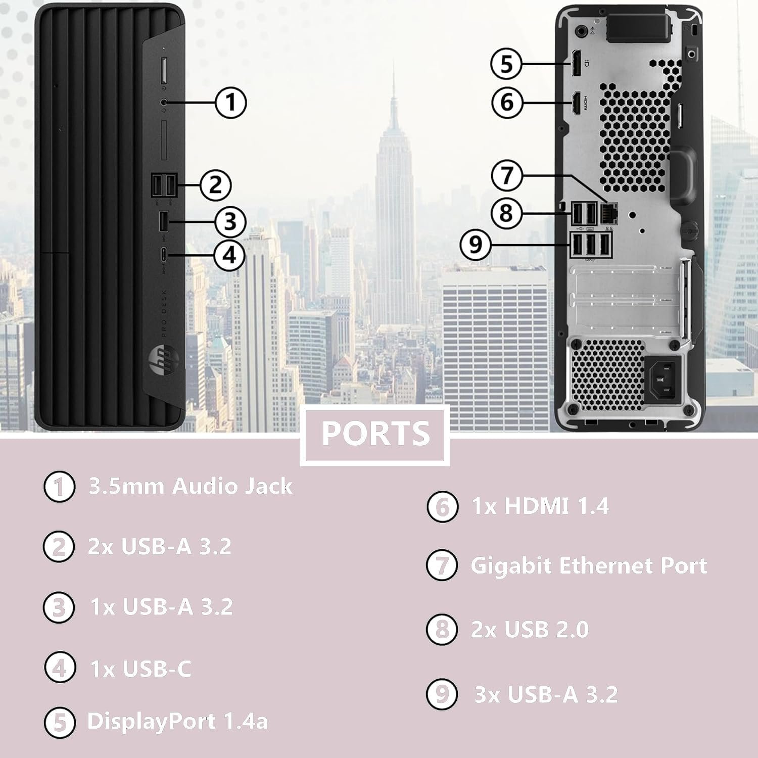 [Tech Specs] 1 x USB Type-C, 3 x USB Type-A, 1 x headphone/microphone combo, 1 x audio-out, 1 x power connector, 1 x RJ-45, 1 x HDMI 1.4, 3 x USB Type-A, 1 x DisplayPort 1.4, 2 x USB 2.0 Type-A, Wired Keyboard & Mouse, Wi-Fi 6 & Bluetooth