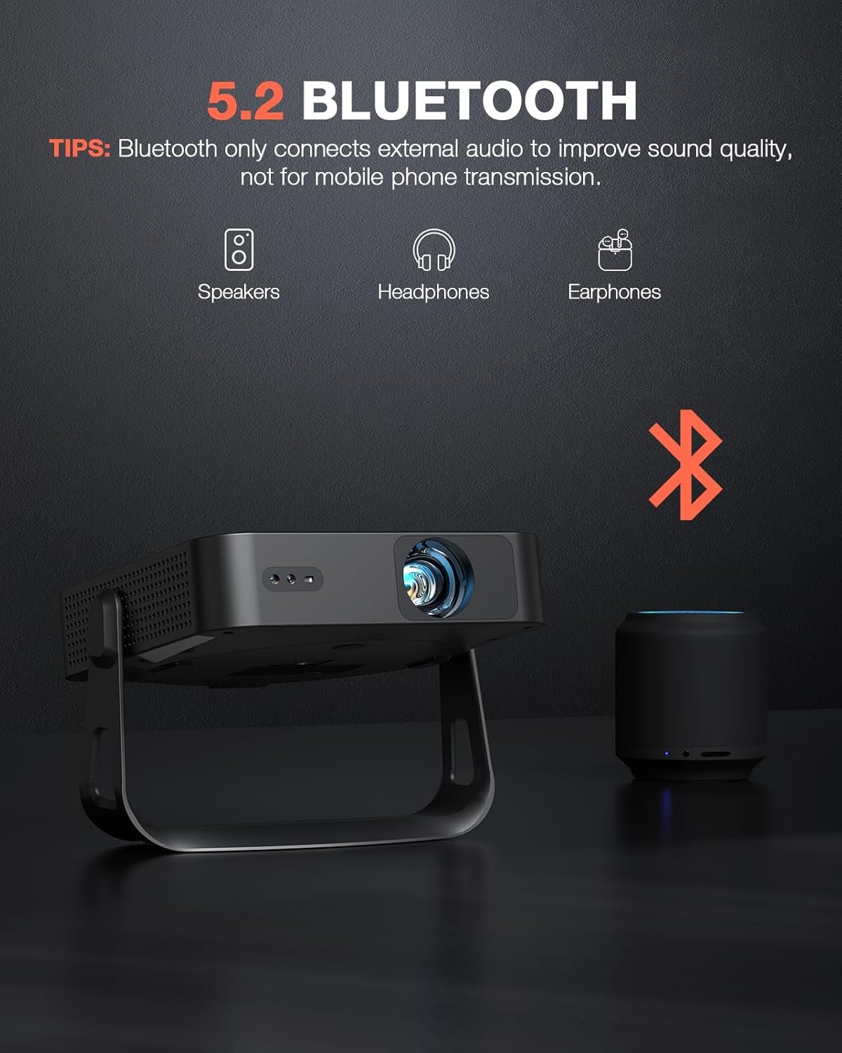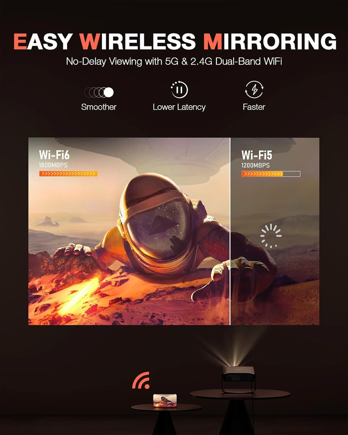 [Lightning-Fast WiFi 6 & Bluetooth 5.2] WiFi 6 ensures stable, rapid signal transmission, empowering the wireless projector with seamless wireless screen mirroring for ultra-smooth movie & gaming sessions. Built-in Bluetooth 5.2 enables the outdoor projector to have seamless audio sync, transforming it into a Bluetooth speaker for on-demand phone music. Immersive viewing awaits! (Due to HDCP copyright limitations, Netflix, Prime Video, Hulu, etc. can only be played via TV Stick, Roku, etc. )