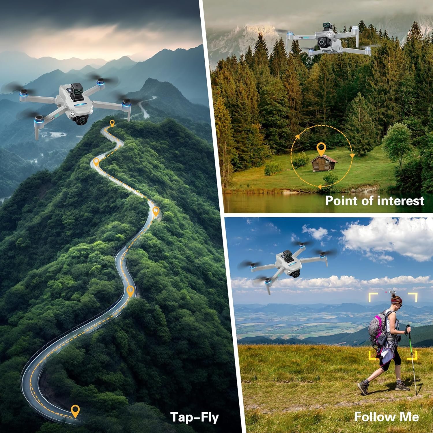 【Smart and Easy to Control】The GPS drone will automatically return to the take-off point when the battery is low, signal is weak, or the return button is pressed. Functions like Follow Me, Waypoint Flight allow users to easily control the drone’s flight path and shooting direction. Additionally, features such as one-key takeoff/landing, headless mode, and speed switching make it easy for beginners to control, providing a more diverse flying experience.